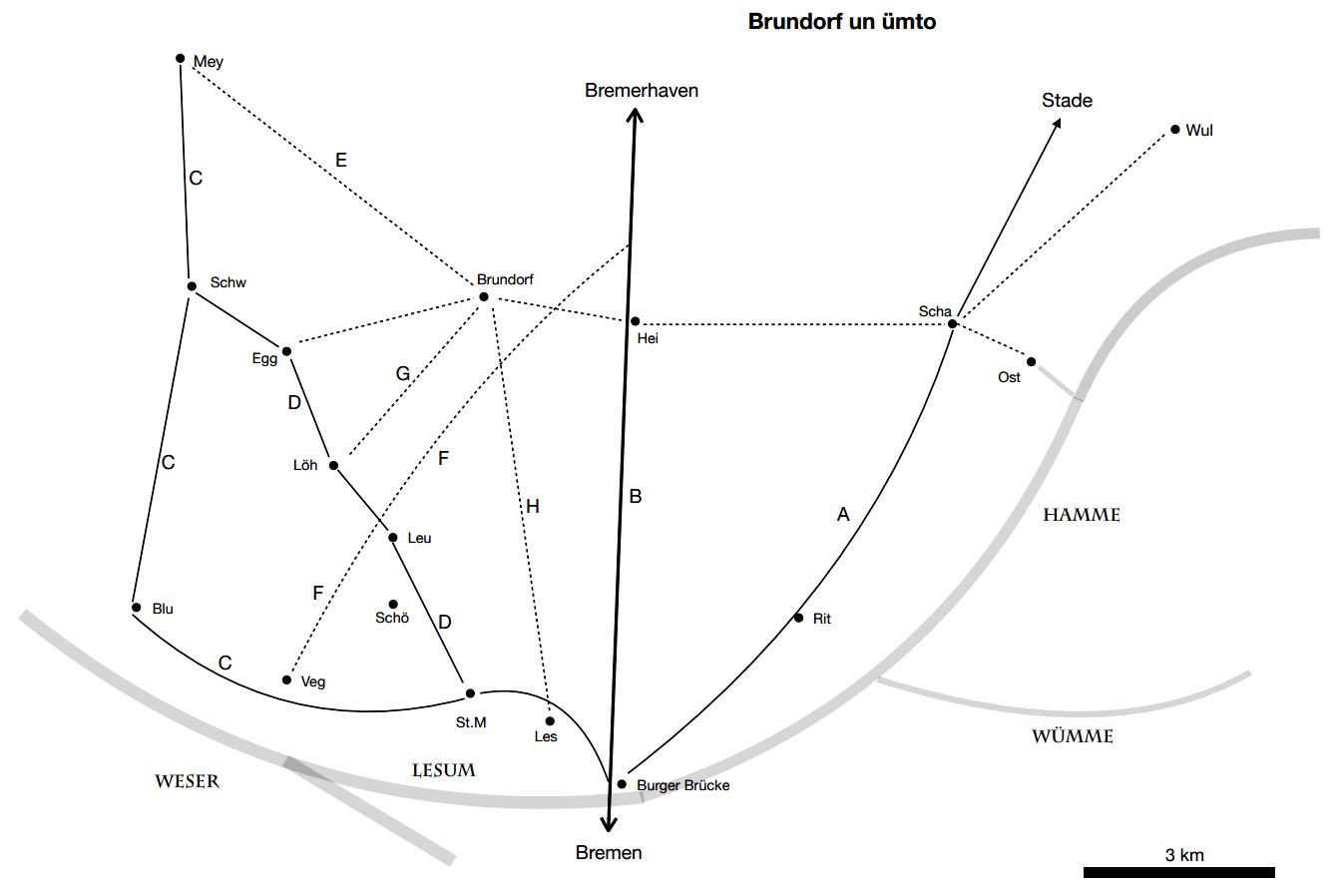 B Die Bremerhavener Heerstraße warrt 1827 vun Bremerhaven ut na Bremen hen anleggt. Se heet vun 1934 an R 6, later denn B6. In uns Rebeet is dat nu blots noch en Landesstraat, vun wegen de Autobahn na Bremerhaven. C Postbuslinje Vegesack, Blumenthal, Schwanewede, Meyenburg. D Leuchtenburger Chaussee (Schwanewede St. Magnus) üm un bi 1850 anleggt, vör den tweten Weltkrieg Koppsteenplaster, na den Krieg Asphalt E De Luftlien vun den Postboten sien Weg dörch Heid un Holt na Brundorf. F/B De ole Stundenweg' vun 1827 is wohraftig en snoorgraad