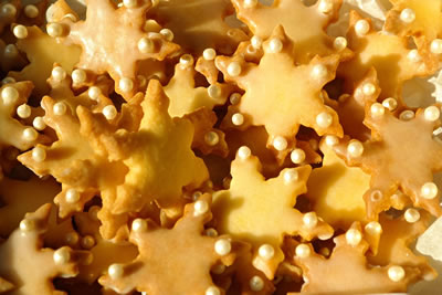 Dor keken all de Steerns in de Köök rin. Dor harr de Modder jüst en grote, swarte Kokenplååt ut den Åven trocken. Op de Kokenplååt legen vele Kokendeegsteerns, dee richtig schöön goldgeel backt weern.