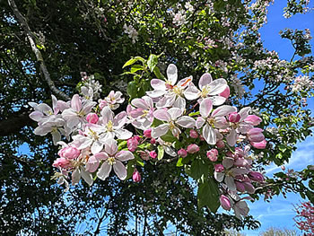 In'n Goorn is allens op eenmal los. De Planten, sogor de Rosen, kriegt Knubben un Bläder, de Immen sünd swoor in de Hornveilchen togang, de Vagels sammelt Nistmateriaal un ok de Marienkävers sünd waak, avers vör de nächtliche Küll söökt se denn doch noch mal Schuul, so as düsse twee Frünnen in mien Insektenhotel.