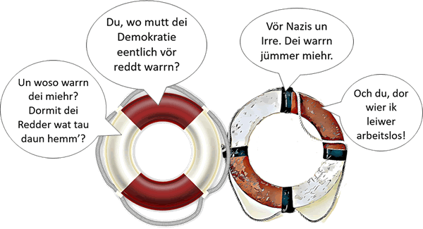 Nich dat dei Arbeit slecht wier; an männich Städen is dat ok blot ein Druppen up'n hitten Stein. Hier un dor kricht 'n Regionalgrupp as dei "Omas gägen Rechts" 'n lütten Tauschuss ut dat Bundsprogramm "Demokratie läben!", un wenn ein Minsch up den Infall kümmt, dat Frömde sik gägensiedig bäder verståhn, wenn's mit "demokratisch" Hülp ehr Fluchtgeschicht riemeln un dei denn in'n "Poetry Project" vörstellen, denn föddert "Demokratie läben!" ok in son'n Fall. Un wecker 'n Vedder in'n anner EU-Land hett, kann denn œwer Grenzen henwech noch Geld ut Brüssel affangen. Un dat allens, üm uns Zivilgesellschaft un dei liberale frieheitliche demokratische Grundordnung tau verdeffendiern.