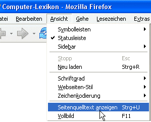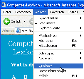 Bedüüd op Ingelsch HyperText Markup Language. Dat's en Programmeerspraak, 'neem de mehrsten Internetsieden in verfaat sünd. Düsse ok. Man vun den HTML-Befehlscode seht Se nix; dat warrt as smucke Websiet darstellt. Dat maakt de Browser: He nimmt de HTML-Befehle un maakt dor en Websiet ut. Den HTML-Code vun düsse Websiet köönt Se sik avers ankieken, wenn Se in Ehrn Browser den Befehl Ansicht | Quelltext (Microsoft Internet Explorer) orr Ansicht | Seitenquelltext anzeigen (Firefox) wählt. De twee Biller hier wiest, woans dat geiht. Wat Se denn seht, sünd de Befehle, de den Frameset för düsse Sieden opbuut. Normaalerwies seht Se bloots dat Ergeevnis, un dat is ok good so, nich?