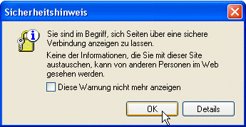 Protokoll för dat Överdragen vun sekerheits-empfindliche Daten, t.B. bi't Online-Banking orr -Shopping. Dat "s" achter "http" steiht för "seker". De Daten warrt in düssen Tostand verslötelt överdragen. Wenn vun dat http-Protokoll op https ümschalt warrt, kriggt Se normalerwies en Sekerheitsmellung so as in dat Bild hier. (De Mellung kann ok utschalt ween.) Dorna steiht https:// vör de Adress. Süh ok bi SSL.