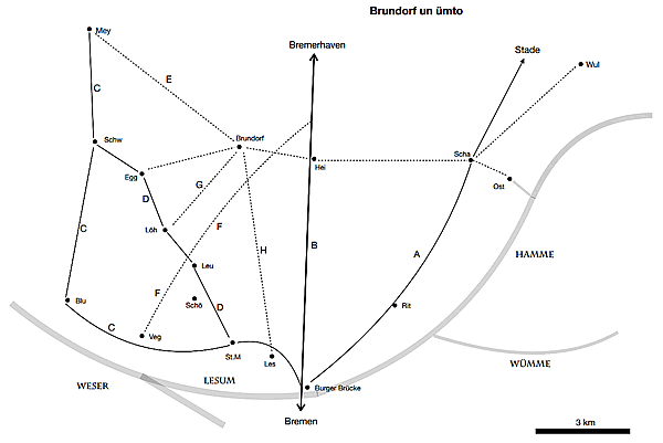 B Die Bremerhavener Heerstraße warrt 1827 vun Bremerhaven ut na Bremen hen anleggt. Se heet vun 1934 an R 6, later denn B6. In uns Rebeet is dat nu blots noch en Landesstraat, vun wegen de Autobahn na Bremerhaven. C Postbuslinje Vegesack, Blumenthal, Schwanewede, Meyenburg. D Leuchtenburger Chaussee (Schwanewede St. Magnus) üm un bi 1850 anleggt, vör den tweten Weltkrieg Koppsteenplaster, na den Krieg Asphalt E De Luftlien vun den Postboten sien Weg dörch Heid un Holt na Brundorf. F/B De ole Stundenweg' vun 1827 is wohraftig en snoorgraad