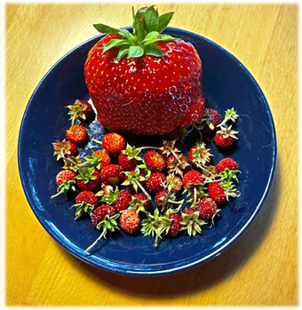 Eerdbeerbeeten, as Olga mi anstött: Ik glööv, wi hefft noch'n beten daröver snackt, dat nich allens beter is, blots wieldat dat grötter is. Uns Walderdberen weren hüüt wedder 'n beten drög