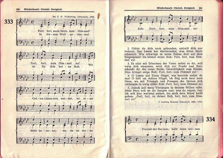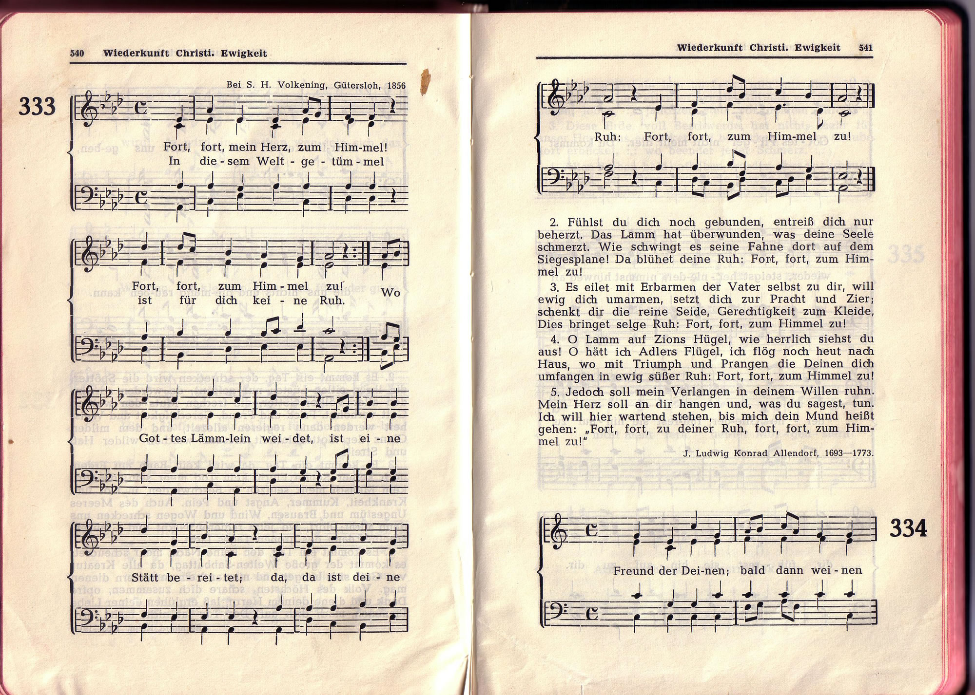 Singt en Leed op den Himmel! Düt schöne Leed vun J.L.K. Allendorf steiht nich in't evangeelsche Gesangbook, dorwegen lever ik de Noten mit. Dat Leed kenn ik siet mien Kinnertied, un wenn düsse Afwennen vun de "Welt" (d.h. in'n geistlichen Sinn allens, wat materiell, materialistisch orr gottsfeern is) ok vundaag nich in den Tiedgeist to passen schient, versteiht een doch, wo dat in swore Tieden de Minschen hulpen hett. Dat Bild vun't Gottslamm, en Symbol Jesu, wiest, dat Jesu Sachtmödigkeit, Gewaltlosigkeit un Opperbereitschap de Wehrlosigkeit vun't Lamm opletzt all Starkden un Mächte vun de Welt övermann is. Dat gifft keen aktuellere Bott as düsse.