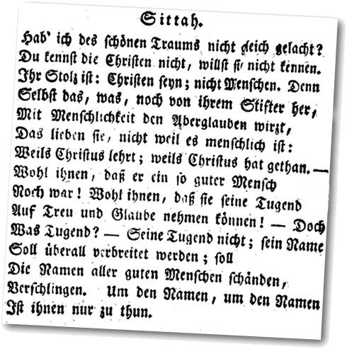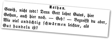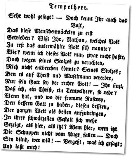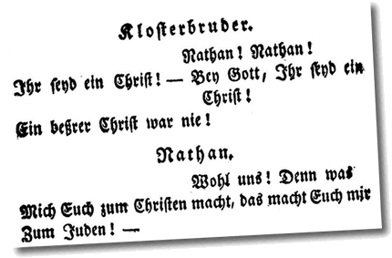 Sabine: Nu schüttst du aver över't Teel rut! Du hest ja sülven seggt, dat is en Problem, wenn de Religioonen denkt, se un bloots se harrn de Wiesheit mit Lepel freten. Denn warrt Religion to en Blankoscheck för Unmoraal. Nathans Tempelherr denkt sogor, dat keen Volk den betern, den besten Gott hett ok de Christen nich. Jüst dorwegen gäärt ja ok in em düsse Woot, düsse Ieversucht op de Juden, de du ok föhlst. Weetst wat? Ik glööv, dat en grote Deel vun den Antisemitismus in't "christliche Avendland" eenfach Neid is. Neid op Gotts eerste Leevde. Dat he sik mit de doren Butenlänners inlaten hett. En elennig Nomadenvolk. Dat kränkt uns. Dat peddt uns op den Slips.