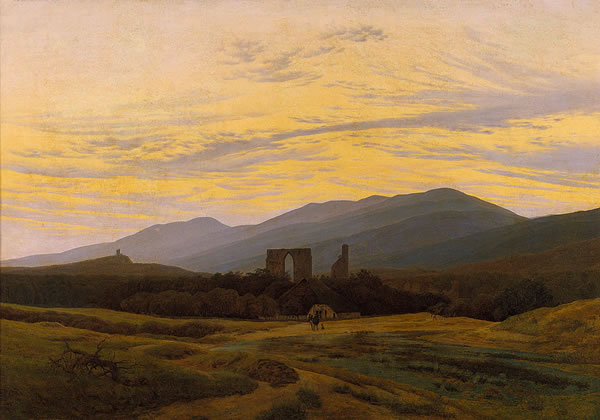 Dor achtern geiht de junge Mann sien Deern is dorbi, em ehr Wollmütz op de Locken to drücken: un grient em an. Dood, wo is dien Stachel? Hölle, wat is nu dien Sieg? Gott is de Leev sülvst, in Persoon. Nix kann di passeern Bild: C.D. Friedrich, De Ruine Eldena