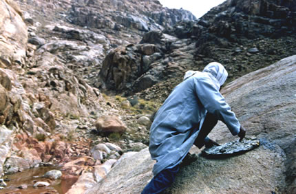 in en Eck to'n Slaap. Wo een dat Uns-Vadder-Beden liernen kann Dat weiten wi, dat dat Hunger in de Welt gifft. Dat vele Kinner veel to frööh starven. De willt ok leven. Wenn di dat In- un Naföhlen in dat hungernd un nootvull Leven swoor föllt, denn treck man maal mit Maten dörch de bargige Wööst vun'n Sinai orrer een anner, ahn Hotel, ahn Imbissbaud. Denn dankst unsen Vadder in Heven för dat Stück Flådenbroot, dat een Beduin för juuch up de Glaut vun uns sammelt Struukwark ut Mehl un Wader backt hett, denn dankst, dat Ela, uns Sinai-Kunnige een Born weit, wo du di Drinkwader upfüllen kannst.