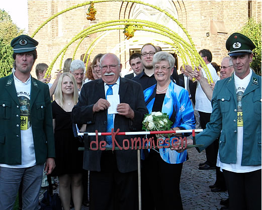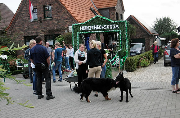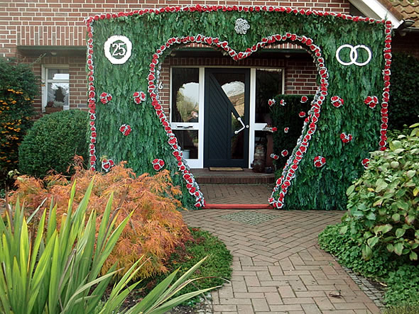 Dat Postenhuus dorachter käm ok noch na vörn. Wi funnen ok noch so een ole geele Telefonzell, wiel de Nawer ja Direkter bi de Telekom is. In dat Hüsken seet noch en Swesterpopp, wiel sien Fru ja Röntgenassistentin is. All dat Gröne schnieden, de Latten tosamentümmern...! Sage un schreibe 4ooo Rosen hebben de Fruenslüüd friemelt. Satt för "intauriewen" geev dat ok. (Natürlich vun binnen.) Ja nu, Rauh, nee, Rauh hebbt wi nich hatt. Stück de Straat rop hett en Nawer Sülwerhochtied. Dat woor fiert. Nawerschaft-Huis schmücken. Aver nich nochmol mit den "Triumphbogen". Nee... nee, wi sünd dor mit "Experten" bestückt. Bi Helmut word de Plan maakt. Die Fruenslüüd seggen, wie dat mutt, un nu buut man schön. Hebben wi ok dohn. Ik weit nich de Taal vun Stunnen, de ik alleen seten heff. Grön schnieden, Gestell tosamentümmern, Maschendroht spannen, Polyesterplatten inbuun un so wieder un so wieder. Un nich bloot ik. De annern ok, so wie sei Tied hadden. Nee, de Sülverhochtiedler hebbt dar nix vun to weiten kregen. As wi dat Hart opbuuten, hebben sei weent vör Rührung.