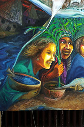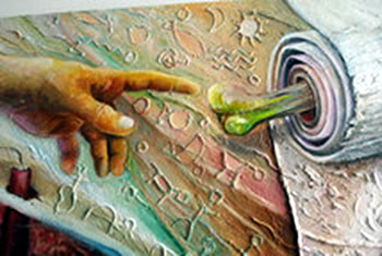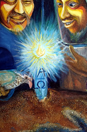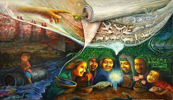 Dat MISEREOR Hungertuch 2009 "Gottes Schöpfung bewahren damit alle leben können" vun Tony Nwachukwu © 2009 MVG, Aachen. Wi, de Redakschoon vun Plattpartu, Marlou Lessing un Rudi Witzke, dankt för de Verlööf MVG Aachen, dat Bild vun dat Hungerdauk hier to nütten. 22.2.2015 |