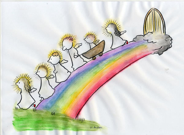 De Hävensboach Oostfreeschkes Platt Dat wee rein een unkomodich Wäär vandoach. Toeers wee dat so heet, dat dat Stroh up d' Land woll Füür fangen kunn un denn wee de Häven tomoal pikkschwaart, as wenn de Welt so stuv ünnergoahn wull. De Rägen kladder ut de Wulken sowat har Alste bit nu in hör Doagen noch nich beläävt. See hukel in d' Köken up dat breede Fensterholt un wull mit hör lüütji Hann'n de Engelstroanen griepen, de buten an de Schieven andoal leepen. Van een Oogenblenkern bit noa d' anner wee dat buten tomoal wäär drööch. So up Schlach as dat anfung'n har, so har dat ok wäär uphollen. De Sünn de schmüster dör de blenkernden Bööm över irgendwat de see sükk säker höögen. "Mama, Mama kiek ähm gau ...!" Över de Häven spann sükk van een noa d' anner Kant een groode klöärigen Boach... Alste kunn dor gannich genooch van sehn. See drück sükk an d' Schiev hör lütji Nöäs rein platt. "Well hört de to?", wull see van hör Moder weeten. Dat düür denn schmoals een Settji, dat Moder dorup antern kunn. See wee bi hör lütji Wicht joa all up een büld gefoat, oaber up sükkse Froagen muß see sükk dat Antern denn doch eers torecht timmern. "Mien Deern dat is een Hävensboach...!" "Un well hört de to ...?", keem dor wäär de Froach. "De hett Petrus moalt kiek Engels, de mooten ov un to moal ümtrecken. Wenneer see alleen ünnerwäägens sünd, denn fleecht see wenneer see moal ümtrekken mooten, denn hevvt see groode Frachtwoagens achter sükk. Un denn mutt Petrus hör helpen. Toeers näämt he siene