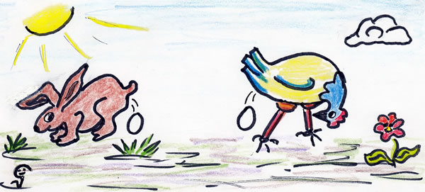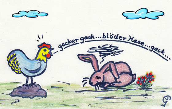 Un wat schall ikk jo särgen denn wee dat Mallör 'türlich groot. So'n glubberiged Höönerei kann näämich schooned Kinnersönndachstüüch reschkoapen mit Eigääl un Eiwitt vullkleien. Dat wee joa nu jüüst jümmers dat moiste Sönndachstüüch, wiel Oostern wee domoals ok all blossich Sönndachs. Nu froacht ji säker, wu dat denn blods angoahn kunn, dat mit de Eieren-Verwesseln. Dat Geböören is heel eenfak dat will ikk jo woll ähm verklookfideln. De Hööner hevvt eenfak de Eieren in de Nüsten vertuuscht utverschkoamt, as dat Feddervolk nu moal is. Hööner kunnen näämich ok domoals all över de oarichsten Soaken lachen un neeschierich ween see so as man wat. Doaran hett sükk ok bit vandoach niks an ännert. Well jo wat anners vertellt, de lücht jo wat vöör ov he käent de Hööner nich. Oaber noch een Karakterbudel beseeten de Ur-Ur-Urgrootöllern van de vandoagigen Hööner see ween över de Moaten ovgünstich. Ovgünstich up de Oosterhoas de kunn koakt Eier lärgen! Wenneer he dat ok blods an Oostern kunn oaber he kunn dat. See as Hööner knoieten un meuden sükk Dach föör Dach mit de Eierlärgeree rüm mennichmoal ween dat liekers goar twee an een Dach, wenneer een Höönerwiefke heel fliedich bi de Produktschon wee.