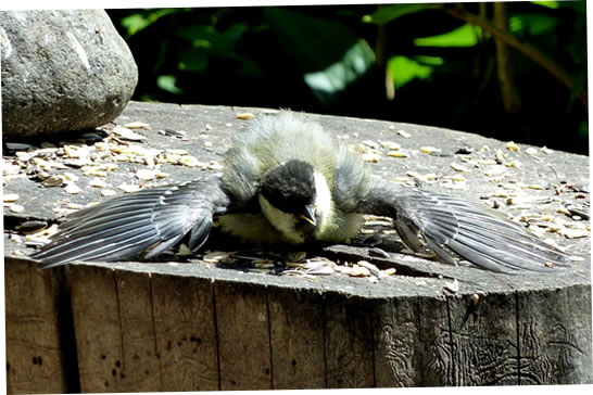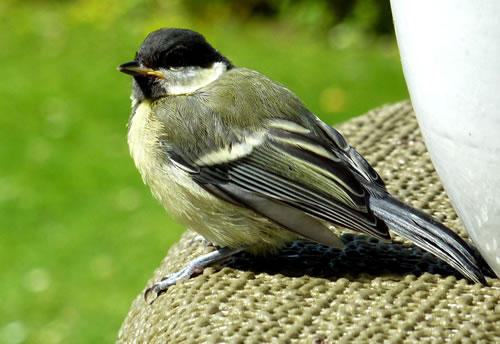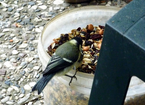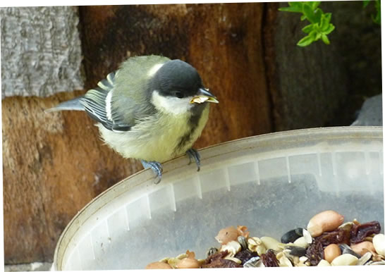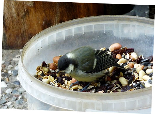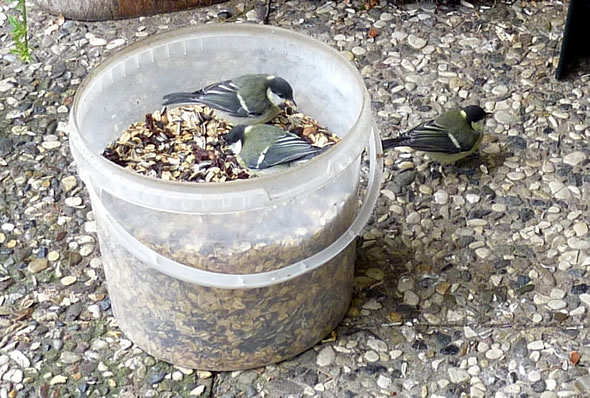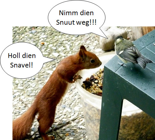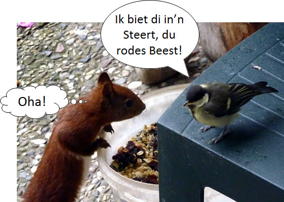 Moin, moin, hier is wedder Juuch Fränzi! In de Eck vun de Terrass stünn doch en Ammer mit Vagelfoder. Dor fleeg ik eerstmal hin.