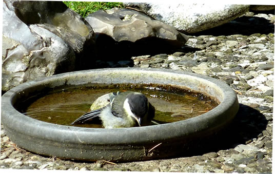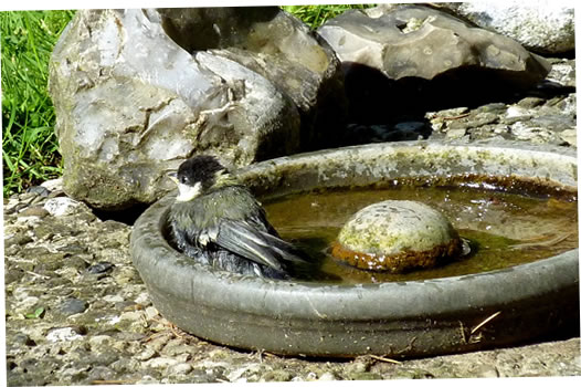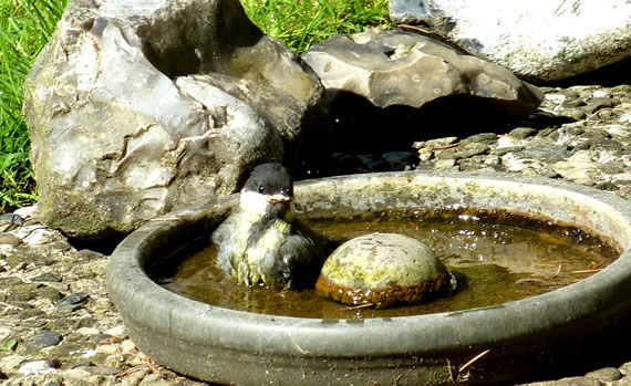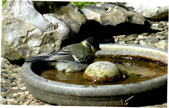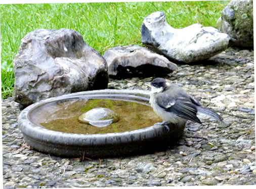 Vun den Lünkendisch kunn ik allens goot översehn. Un wohrhaftig, dor ünnen weer en Vageltränke.
