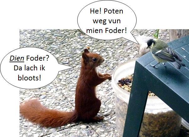Baden maakt ok Hunger. Dat heff ik markt. Un ik will ja groot un stark warrn! As ik na den Ammer keem, seet dor doch al de Eekkater un leet sik dat smecken! Dat kunn ik nich tolaten. Bang harr ik nich, ik heff mi ganz eenfach up den Hocker sett un em utschimpt. Aver he leet sik nich stören, stell sik up de Achterbeen un haal sik vun dat Vagelfoder! Ik heff wieder mit em schimpt. He müss mi doch ok an den Ammer mit dat Vagelfoder laten! Endlich harr he en Insehn un leet mi an den Ammer.