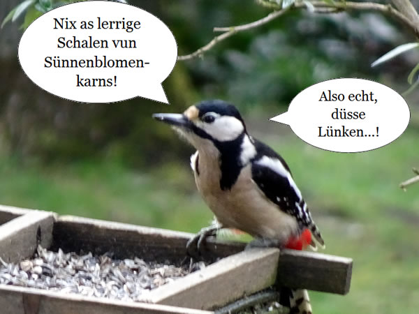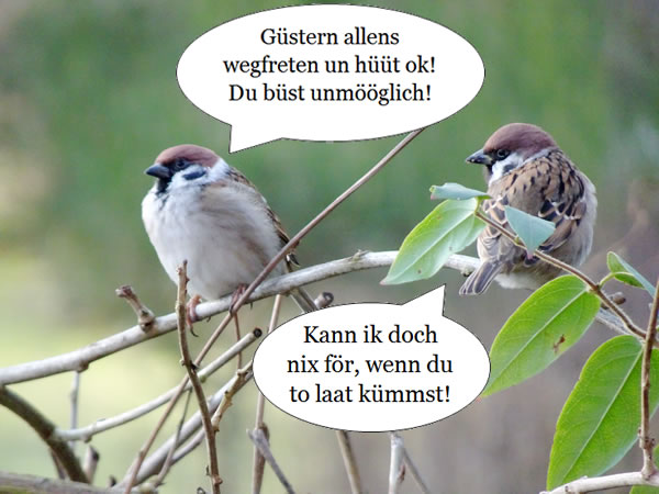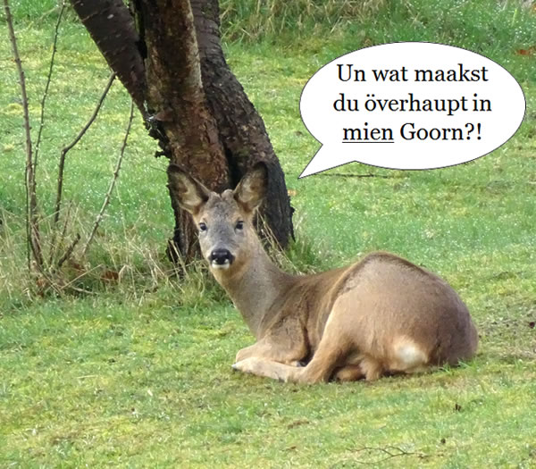vun Herbert Timm In mien groten Goorn, de an'n Rand vun't Dörp liggt, is jümmers düchtig wat loos. Wenn ik morgens ut'n Finster kiek, denn sünd de Spatzen al düchtig an't Tschilpen. Herr un Fro Specht kiekt bi dat Vagelfutter vörbi. De Katteker kiekt ok al na, of wat överbleben is. De Rehfamilie treckt sik vun de Rosen torüch un geiht na de Wisch to. Nülichs heff ik sogars en Reh drapen, dat sik to'n Slapen henleggt harr. Wenn ik nipp un nau tohöörn do, kann ik ok verstahn, wat de Besökers so seggt. Fro Specht: "Na, dat süht so ut, as wenn de Lünken
