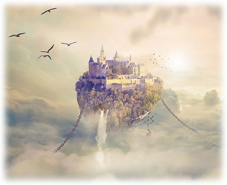 "Noch een Wulkenhuus wieder, dor steiht: Sneeflock, Landschopsmålerin. Nu kümmt een ganze Reeg vun Hüüs, an dee desülvige Nååm steiht. Wohrschienlich wåhnt dor luter Verwandte tosåmen. Pass op: Snee, Zuckerbäcker; Snee, Lienwever; Snee, Kappenmåker. Åvers denn kååmt wedder annere: Wind, Stråtenkehrer; Wind, Konzertsinger; Sünnenstråhl, Goldarbeiter; — un so geiht't wieder. Fein denk ik mi dat, all de Wulkenslötter. Mit Ärkners un Toorns, mit rode un gröne un gollene Målerien sünd se utstaffeert, un in de Sünn schemert se sneewitt. Männichmål kååmt ok lüttje Engels op Besöök. Denn lüden se un fråågt: ,Goden Dag! Is de Herr Steern to Huus? De Lanteern an'n gollenen Wågen will nich recht brennen — ik denk, Herr Steern kann se wedder in't Loot bringen.'