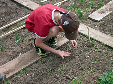 vör, un se harkt flietig acheran. Tant Eva deelt de Beeten af, för jeden een. Denn trampelt se all de Wegen fast, åvers vörsichtig heel vörsichtig, dormit keeneen op de Beeten pedd! Un denn wiest de Tant jüm, wordennig se de Rillen måken mööt, jümmers dweer över dat Beet, een neven de annere. Dat is gor nich so eenfach! An'n swoorsten find Bubi dat. Hee müch lever glieks Radieschen eten as seien. Denn bringt Tant Eva de lütten, hellroden Såmenköörn. Åvers dor weern all de Kinner untofreden. "Ååch, dat sünd ja luter Steens! Dorut schullen