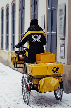 legen de Paketen in sien Binneret; nu åvers weer dat ganze Postwågendack