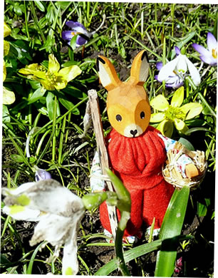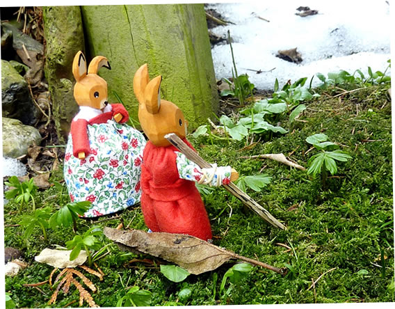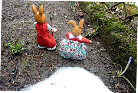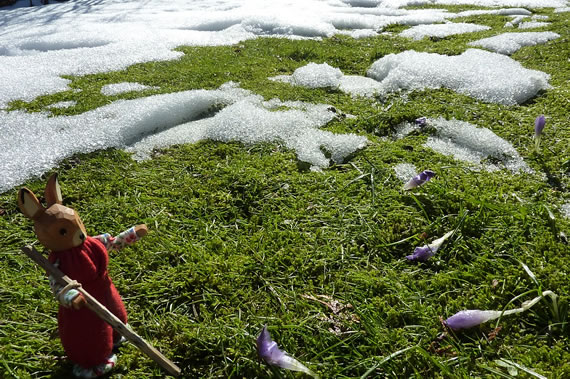 Up den Weg na ünnen sehgen de beiden, wat de Frost för'n Schaden anricht harr. Snuffi wull noch mal an den Märzenbeker trecken un bimmeln. Dat güng nich mehr, de weer twei! De lütten Krokus legen al platt up den Rasen. Dat sehg richtig trurig ut.