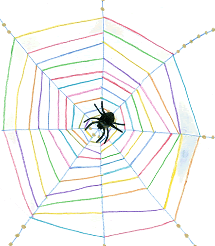 "Hopsa, Popsa, Schnopsa", se snippt mit den Duum un de Middelfinger, un Louisa, de Krüüzspinn, de bi ehr överwintert, kiekt ganz verbaast op ehr Spinnennett. Dat süht miteens so annershaftig ut. De Spinnenfadems sünd nich mehr witt, sünnern bunt. Rood, blaag, gröön, orange un vigelett lücht se, un an'n Rand blenkert Parlen. Verfehrt jumpt se bikant un verstekt sik achter de Tassen, de an de Wand op Hokens bammeln doot. Talke mutt gniggeln un maakt den Töver fix wedder weg. Dat klappt.