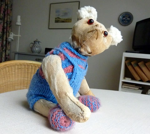 Ik heff aver noch Glück hatt. Enes Daags keem de Huusfru up den Böön. Se söch enen Karton un funn mi! Ik leeg mank tosamenknüllt Papier un olle Pappkartons un weer bannig ramponeert. "Ach, Teddy, wat hebbt se denn mit di maakt!", reep se un slöög de Hannen över den Kopp tosamen. Se nehm mi mit na ünnen in de warme Stuuv. Strick mi enen bunten Antog un neih mi ut Schaapsfell en poor niege Ohrn. An de kaputten Fööt kreeg ik Puschen. De Hannen un mien Steert wöörn mit Plaster bekleevt. So kunn ik mi wedder ünner de Lüüd sehn laten.