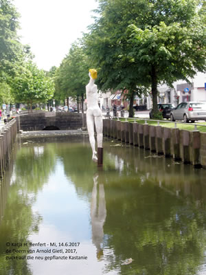 Mit de beid Hannen will de Künstler seggen: nehmen un geven. He meent, de goldfarven, opene Hand is dat geven. Ik heff seggt: Nee, jümmer de Hand opholen, dat is nehmen, ik will hebben ... Aver wie dat mit de Kunst so is: elkeen hett sien egen