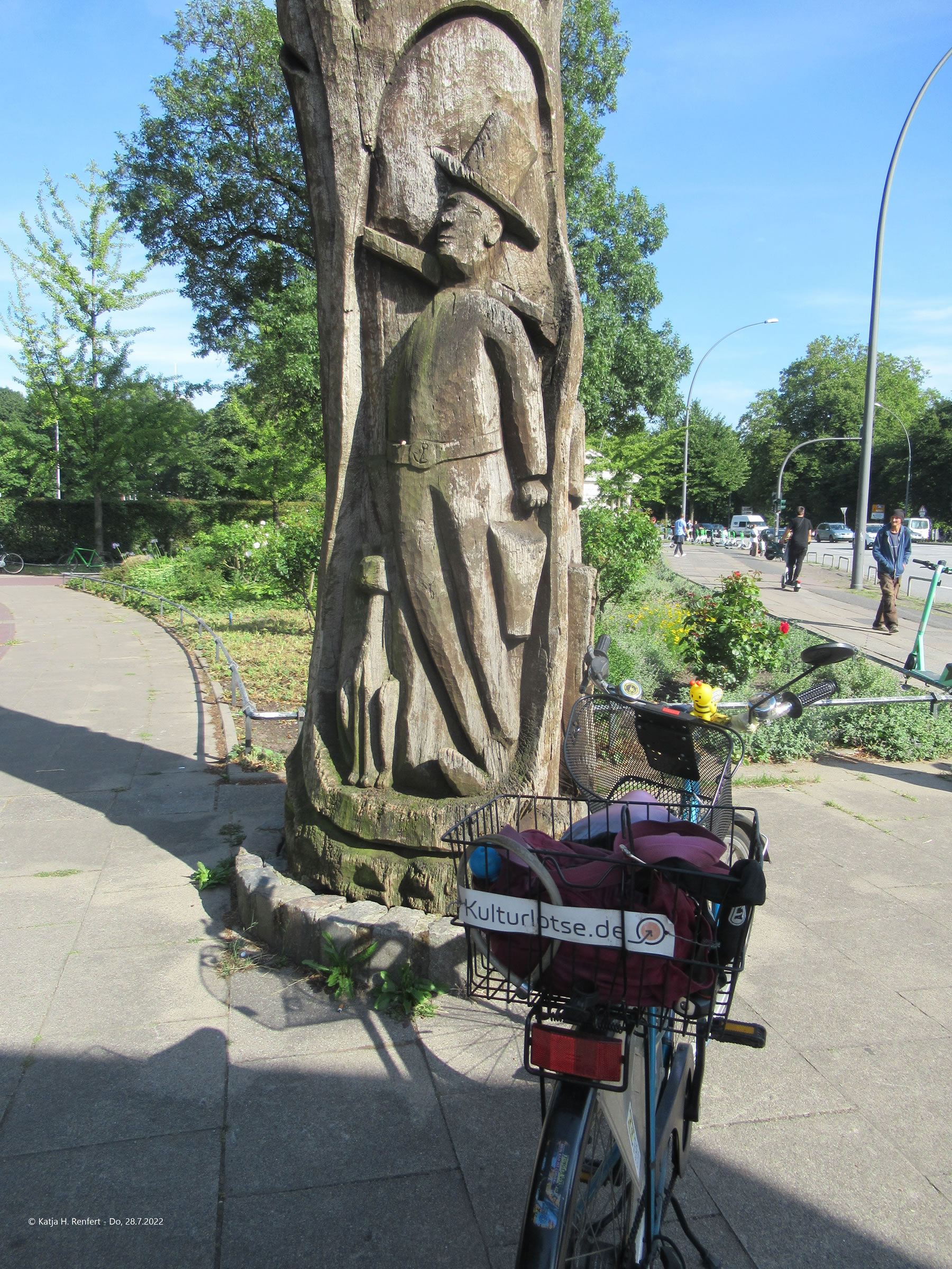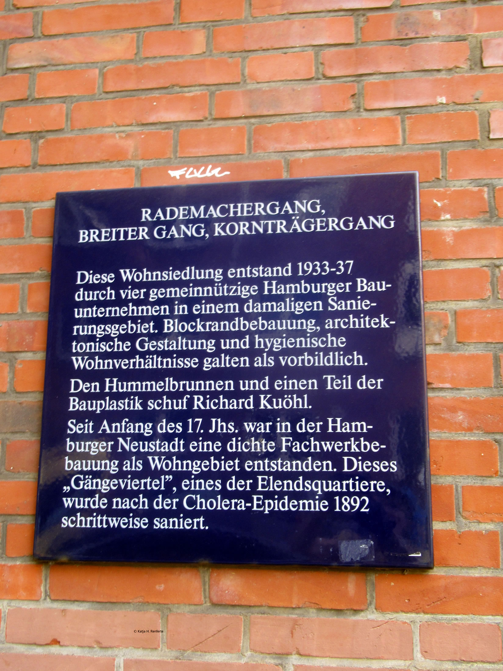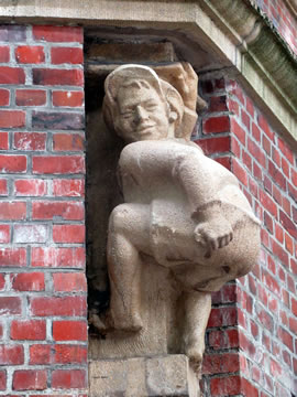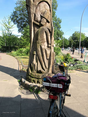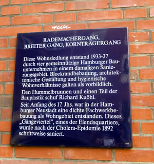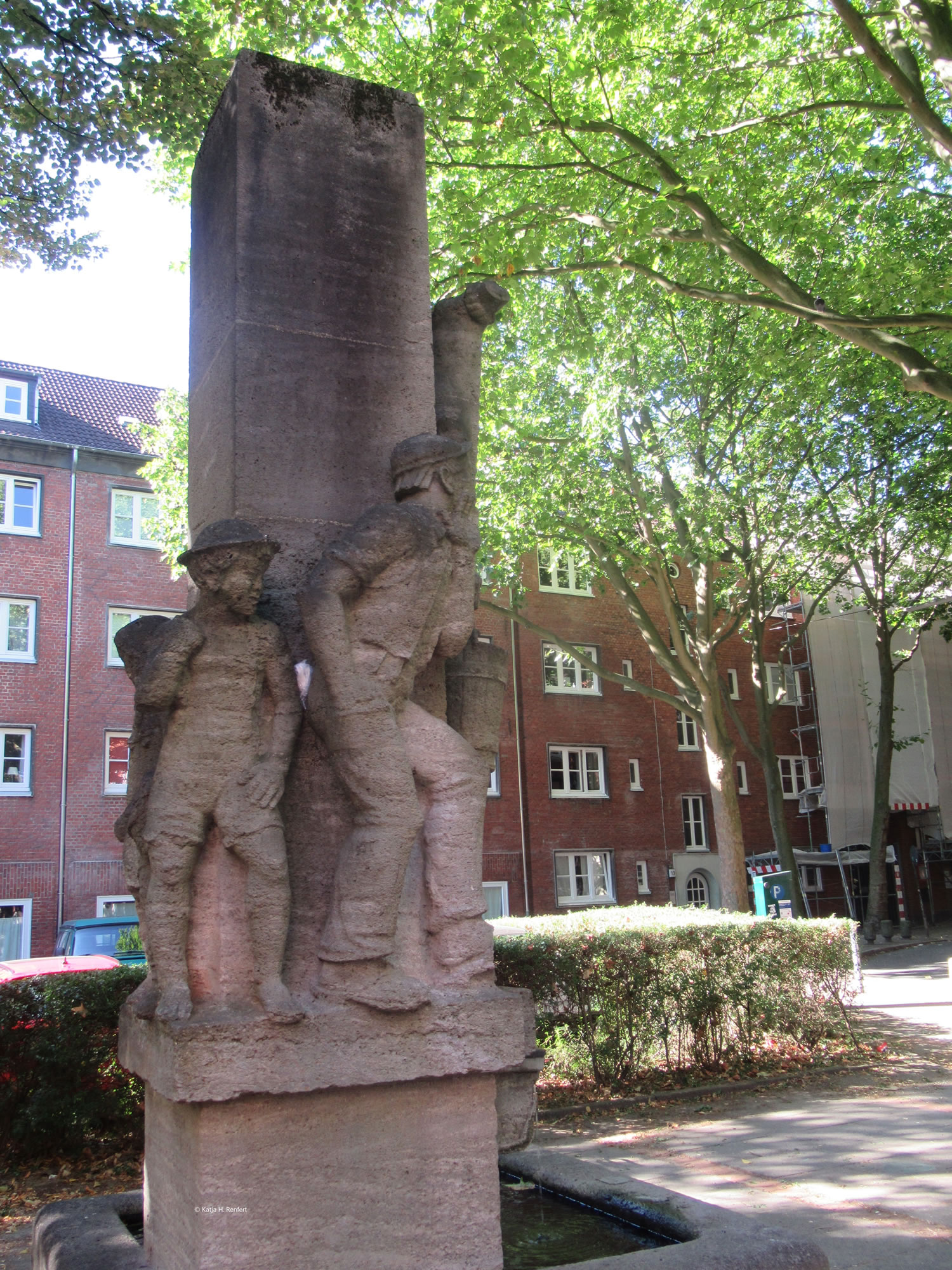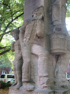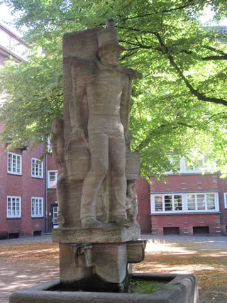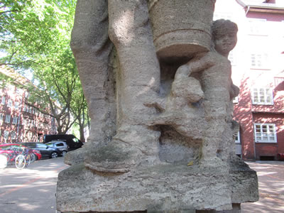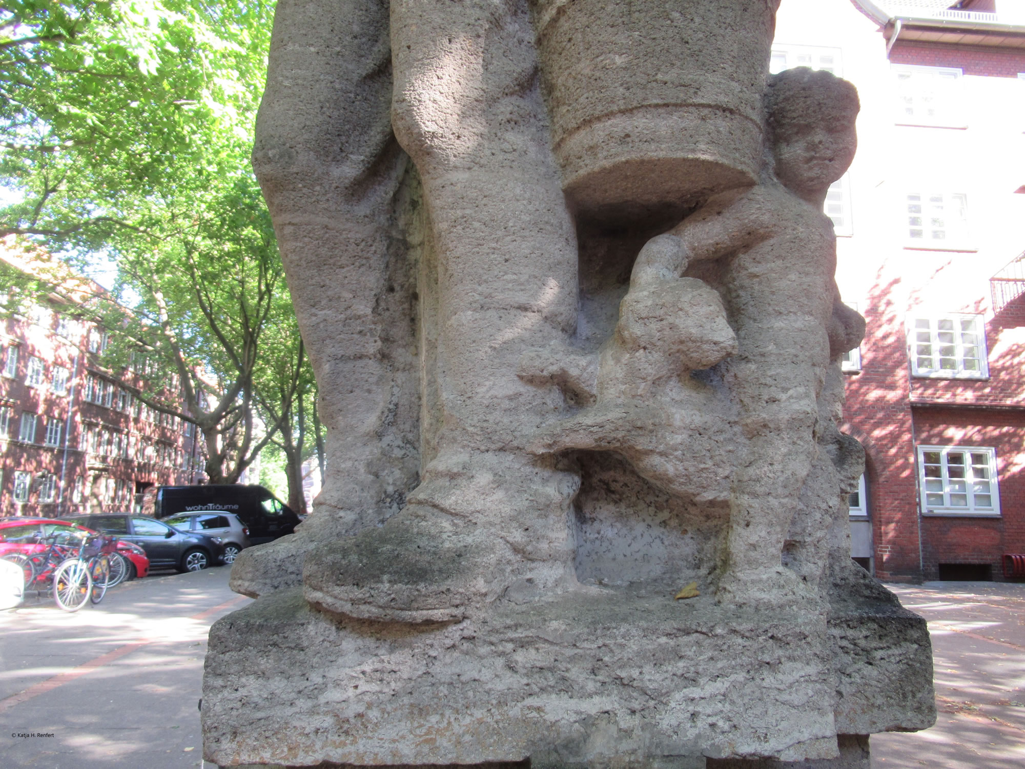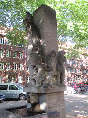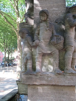 ut Sandsteen maakt. De steiht in'n Rademachergang. Op den Brunnen steiht Hummel mit sien beiden Ammers, achter em veer Gören. De gröttste Jung röppt em wat to, achter em steiht 'n lüttjeren Jung, un en Deern, de en Korv mit Blomen in ehr linke Hand höllt, faat mit de rechte Hand ehrn lütten Broder fast. De hett en Lamm in'n Arm.