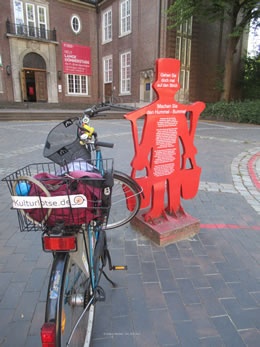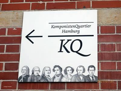 Gaht Se doch mol op den Streek maakt Se den Wenn Se op den roden Streek lang gaht, kummt Se in dat historisch spannende un opregende Quartier vun de Hamborger Neustadt. Egentlich müss dat Altstadt heeten, denn dor an' Hafenrand is de Hansestadt entstahn. Ik bün denn mit mien Fohrrad vun Herrn Hummel op den Streek längs lopen und keem to dat KomponistenQuartier. As op mien Foto to sehn is: man blots een Fru mang de Mannslüüd. Dat is Fanny Hensel, born as Fanny Mendelssohn. Se hett 1805 1847 leevt. In dat Book von Astrid Schmeda Quasi una Fantasia Eine Reise mit Fanny Mendelssohn (Edition Nautilus, Hamborg 2002) steiht, dat Fannys Vater ehr verboden hett, ehr Kompositionen to veröffentlichen. Dat heet: ehr Broder Felix Mendelssohn hett dat as siene Werke utgeven. As Fanny mit ehrn Mann Wilhelm Hensel un ehrn Söhn Sebastian 'n Johr lang dörch Italien reist weer, hett se för jeden Monat en Komposition schreven. De CD is in dat Book. In dat Komponisten-Quartier is ünner annern de Niederdeutsche Bibliothek vun de Carl-Toepfer-Stiftung. Dor kannst nich bloots Böker, Spelen, CDs, Tietschriften un Materialien för den Ünnerricht utlehnen, sünnern dor findt uk Veranstalten statt, to'n Bispeel an 5. und 6. November düt Johr de Plattdüütsche Bookmess in den Lichtwark-Saal in de Neanderstraat 22. In dat Museum KomponistInnen-Quartier sünd in de Utstellungs-Rüüm 'n Barg Saaken över Georg Philipp Telemann, Carl Philipp Emanuel Bach, Johann Adolf Hasse, Fanny und Felix Mendelssohn, Johannes Brahms un Gustav Mahler to sehn un to hören. Se weern all dor op de Welt kamen or hebbt dor warkt.