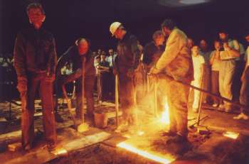 "Festgemauert" hebbt wi nu, man wat is mit "in der Erden"? De Eer kümmt nu dorto. De ganze Gruuv warrt Schicht üm Schicht mit Eer toschippt, de orrig fastpedd warrt. Anners wöör de Mantel sachs bi't Geten vun de Klock tweispringen, wieldat he de Hitt un den Druck nich alleen uthollen kann. Dat mutt de Eer opfangen. Bloots de Infüllstutzen un de so nöömten "Windpiepen" kiekt achterna noch rut. An dat Infülllock warrt nu en Rinne anbröcht, dör de dat hitte Metall lopen schall. Jetzt, Gesellen, frisch! Mennig Stünnen vör den Guss mutt de Bronze in den Smöltaven hitt maakt warrn. Klockenbronze orr "Klockenspies", dat is en Legeern (Legierung) ut 78% Kopper un 22% Tinn. Dat allens mutt good vermengelt ween un en Tempratuur vun 1100°C hebben, denn kann't Losgahn mit dat Geten. Stoßt den Zapfen aus! De Tappen vun den Smöltaven warrt utstött, un dat glöhnig Metall flütt dör de apen Rinn na dat Infülllock un verswinnt in de Eer. Wat passeert dor? De Bronze verdeelt sik in de holle Klockenfoorm. De Luft, de dor ünnereerdsch dör dat Metall verdrängt warrt, suust dör de "Windpiepen" rut. Anners kunn dat Metall ja nich in de Foorm rin de Luft mutt rut. In die Erd ist's aufgenommen, Ja, dat weetst nienich. Kannst nich ünner de Eer kieken. Klockengeters vundaag geet mehrst bloots poormal in't Johr, dorför avers an een Geetdaag mehrst en ganz Dutz orr mehr Klocken; se füllt dorto en grote Gruuv mit de Klockenfoormen, denn Eer rup, un vun den Smöltaven föhrt vele Rinnen to de Infüllstutzen vun de enkelten Klocken. Man wenn dat gaten is, heet dat töven. Bis die Glocke sich verkühlet, De Klockengeters vundaag maakt in de Twüschentiet sachs ehrn Bürokraam. Man dat duert bet to dree Daag, bet de Bronze starr un dat Ganze koolt noog is, dat de Klock ruthaalt warrn kann. Denn mutt toeerst buddelt warrn, bet de Mantel vörtüüg kümmt. Denn den Mantel wegkloppen... Nun zerbrecht mir das Gebäude, ...denn sühst al dat Metall vun de Klock: Freude hat mir Gott gegeben! Amenn mutt natüürlich ok de Keern wegkloppt warrn, de Klock warrt reinlich maakt, poleert un op ehr musikalische Qualität pröövt (is dat ok würklich de Toon F? Klingt he rein un good?). Un denn, wenn allens recht un richtig is, denn kann de Klock an ehr Arbeit gahn un klingen. Bet 14 Övertöön geevt den Toon sin Klangfarv, un de Hall vun en grote Klock kann bet 5 Minuten naklingen. Jetzo mit der Kraft des Stranges |