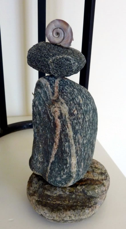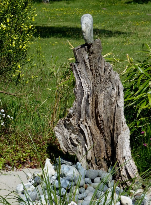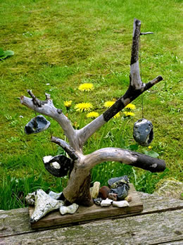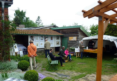 De harr ut luder Natuursteen un Driefholt Figuren maakt. De Oostsee weer nich wiet. Dat weer wat för uns. Höhnergötter hüngen an enen olen Boomstubben. En richtig Kunstwark! De Steen un dat Holt harr he mit sien Fru an de Küst sammelt. Ganz begeistert vun düsse Kunstwarken möken wi uns dörch de frische gröne Saat up de Wiederfohrt.
