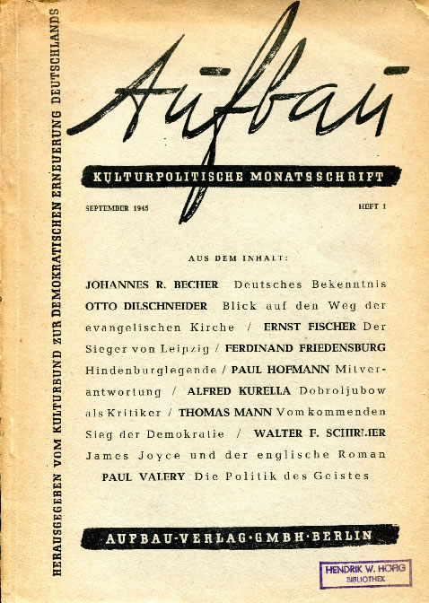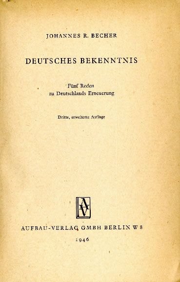 So stunn dat 1945 up de eerste Siet van dat lütt' Book "Deutsches Bekenntnis", een van de eersten Schriften, de na dat Enn van't Hitlerriek rutkamen sünd. In mien Schapp steiht de darde Uplaag van 1946, "dritte, erweiterte Auflage", un rutbrocht harr dat de Aufbau-Verlag in't russisch besett Berlin. Denn de Verfater keem ut'n Exil in de Sowjetunion, een van de eersten, glieks achter de russischen Truppen: de Schrieversmann Johannes Robert Becher, born 1891 in München, storven 1958 in Berlin. 1954 worr he Kultusminister van de DDR. Dat Book is ut Reden un Upsetten ut Becher sien eerst Johr in Berlin tohoopbrocht; de Upsatz "Deutsches Bekenntnis" weer in dat eerste Heft van "Aufbau" druckt worrn. Mit disse Tietschrift wull Becher daarto bidregen, dat siene Landslüüd wedder to de Demokratie torüchfinnen deen. He weer sik säker, dat Düütschland nich sünner ene sozialistische Sellschapsornen weder up de Been kamen kunn, un wenn he "Deutschland" see, dennso meent he en sozialistisch Düütschland; man de Toon leeg daarbi up "Düütschland". Dat de Geschicht up twee düütsche Staaten rutleep, dat weer nich in sienen Sinn. "Deutschland wird ein freiheitliches, demokratisches Deutschland sein oder politisch-moralisches Trümmerland, geschichtliches Niemandsland", schreev he. Dat sünd nu Wöör, de laat sik mit Ünnerscheed verstahn, dat hett sik von 1945 bet hüüt dütlich rutstellt. In Schwerin heel Becher ene Reed to'n Begünn van'n Nürnberger Prozess, de hier afdruckt is un mit disse twee Regen endt:
