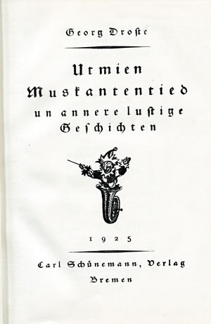 Över de Tieden redd heff ik Ut mien Muskantentied un annere lustige Geschichten, dat de Carl Schünemann Verlag in't Johr 1925 verleggt harr. Dunnemaals verstunnen se Böker to maken: Fienet Pappier, akkerater Druck sünner Fehler (un dat is nich licht, Plattdüütsch to'n Druck to bringen!), faster Inband, un de Schrift kannst ok hüüt noch goot lesen, ok wenn dat Fraktur is, de ole düütsche Schrifttype. En Book, dat sympathisch is un sik goot anfaten lett. "Musikantentied" dat hört sich meist an as bi Fritz Reuter: Stromtiet, Franzosentiet, Festungstiet. Un dat is ok woll so. Döntjes in Vers un Prosa, lustige Gedichten un Geschichten, dat harrn sik de plattdüütschen Schrieverslüüd van Reuter afkeken, un dat gellt bet hüüt. Kümmt daarop an, wat een daarvan maken deit. Un Georg Droste maak daar sien heel egen Werlt van. He fangt mit en poor Sieden Dichtkunst un Plattdütsch an (ik geev dat so wedder, as he de Bookstaven sett harr). Dichten is jümmer Lögen, dat is sien Menen. Aver en Lögen, wo en op stolt wesen kann. "Ick mutt hüte noch hartlich lachen," schrifft he, "wenn ick daran truggedenk, datt mi kortens mien olen Schollehrer besochde, mi bie de Schullern packde un hen un her schuddelde un sä: Oh Georg, Georg, was kannst du lügen.' Dat Kumpelment weer mi mehr wert, as lange Strämels, de de Bläder öber Usereen bringen doht." Un wat seggt he över de Spraak? "Ut den richtigen Mund un ut de richtige Feddern kann use Plattdütsch hoch int Blaue stiegen un quinkeleern, as dat Leberken an'n Fröhjahrsmorgen. Dat kann aber ok brusen un donnern as de Stormwind, de de Eeken tuust, un denn wedder leeflich lachen, as de Sunnenschien, de öber de Heide lacht. Ok den vergnögden Sinn, den plattdütschen Volkswitz, den Volkshumor will't wi fastholen un hegen un plegen, anners wurd us 'n schönet Stuck von use dütsche Volksseele verlaren gahn." Un denn gifft dat, to'n Bispill, Bremer Geschichten as de van de Dodenladen hüüt warrt dat Sterbeversicherung nöömt: "Un ick segg so väl: de ole gode Tied schall leben! Un use Dodenladen daneben! Wenn dar von Dage ok'n annern Wind rinkamen is, wenn se sick ok hüte ganz fien up Hochdütsch Sterbekassen' nennt: leben schöt se doch, dat Leben is un blift doch ummer dat eenzigste Krut, wat gegen den Dod wussen is! Un dat weer 'n Jammer, wenn use Dodenladen mal dod gungen!" Of de Versöök van en Bremer Zigarrnmaker in de Geschicht Plattdütsch buten Lands, in Baltimore in de USA Arbeit in sien Warf to finnen: "De Portjee, de ok Dütsch snackte, tuckschullerde un sä, datt allens besett't un nix to maken weer. Fritz versochte nu, den Mann to öbertügen, datt he'n Bremer weer, un de Bremers weern doch as duchtige Zigarrnmakers in'r ganzen Welt bekannt. Bremer her Bremer hin!' sä de Portjee, das kann jeder sagen! Womit wollen Sie das beweisen, daß Sie 'n Bremer sind?' "Wenn dat nich globen wullt, denn gah mi up'n Puckel sitten! Du Äbax!' sä Fritz toletzt vergrellt un dreihde sick um ton Weggahn. Wat? Äbax?' klung em dat achternah, Minsch kumm her, du schast Arbeit hebben! Du bist'n Bremer!'" Un wi, as de Lesers van 2015, schöölt nu weten, wat Äbax is. Woll nix Fründlichet dat is schaad, dat ik keen Bremer Woordenbook vörwiesen kann, ik kenn dat ok nich, wi sünd jo blots ut Bremerhoben. |