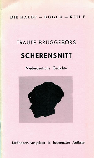 1980 keem mi en lüttet Book van de Fehrs-Gill to Hannen, Spegelbild van Traute Brüggebors. Dat gifft noch en Heft van ehr, negen Gedichten op acht Sieden: Scherensnitt van 1977, man de sünd ok all in Spegelbild to finnen. Hett mi toeerst nix seggt, de Naam; man as ik de 60 Sieden dörleest harr, weer ik hen un weg. In de dore Tiet stunnen Versen up Platt meist jümmers noch in de Traditschoon van Klaus Groth. Dat Niegste un Modernste harr Hermann Claudius schreven, un de weer 1878 boren. Van Lüüd as Moritz Jahn of Siegfried Kessemeier harr ik noch nie nix hört. Nu aver disse Traute! Dat weern Versen, daar brukste di nich eerst in'ne vergeten Tiet rintofinnen, dat weern de Geföhlen un Gedanken van junge Lüüd dunnemaals wuß ik noch goot, wo sik dat anföhlen deit, wenn een jung is. Mit de Freud un den Moot, in de Werlt un in dat Leven to stüern un op de anner Siet swoormödig un deepsinnig: