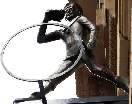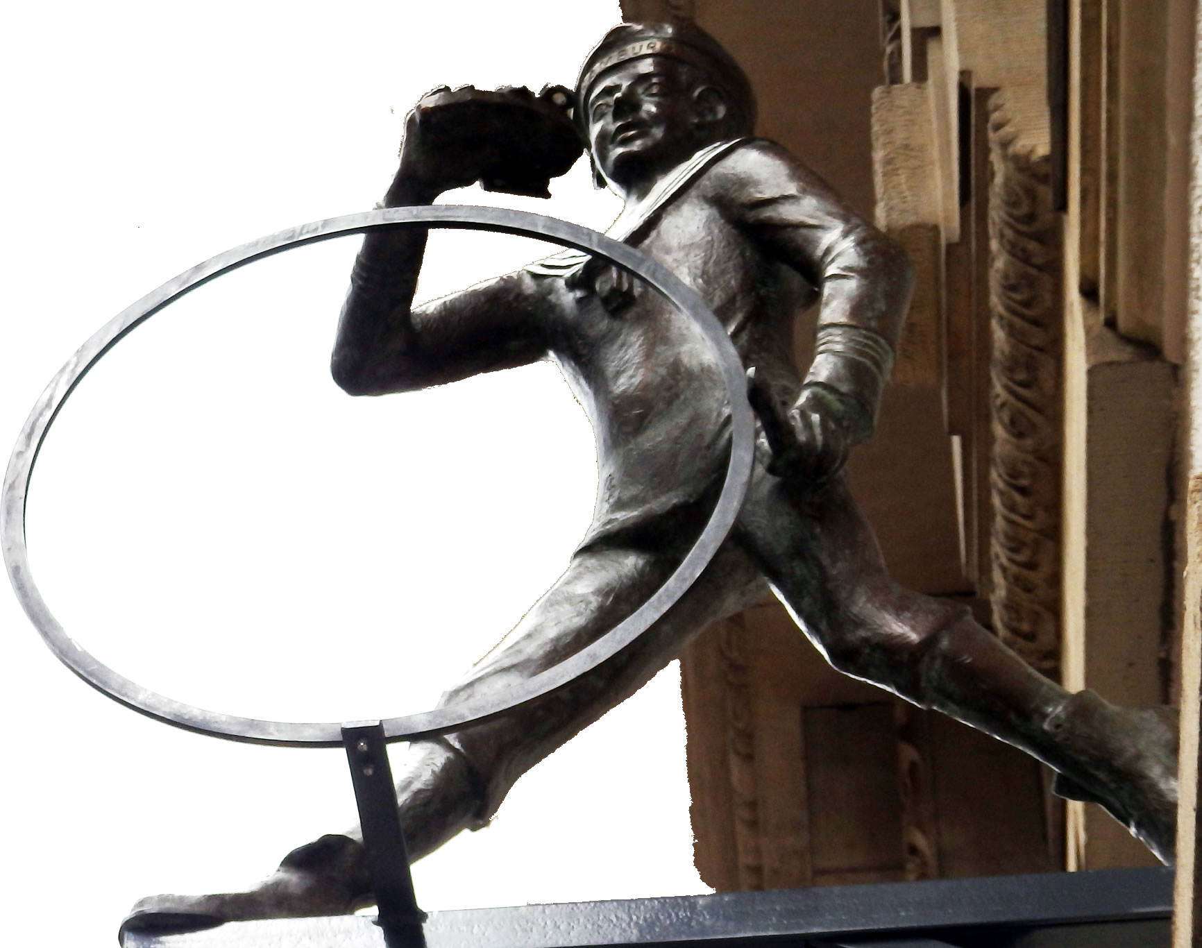 Hüüt kennt wi düt Speeltüüch as "Tüdelband", un dorwegen is dat good, dat düsse Skulptur dat richtig wiest: "Tüdelband" is en Verdreihn, villicht wieldat de Jung ja "in'n Tüdel" keem. Avers wenn he dor so stunn, an de Eck, apensichtlich jüst in Roh mit Band un Stock dor mutt he schon en rechten Töffel west ween, wenn he sik dormit so vertüdeln kunn, nich? Siegfried Assmann wiest uns den Jung mit dat Trudelband avers in vulle Aktioon, he steiht nich an'e Eck, sünnern drifft mit de linke Hand den Riepen, wieldess he in de rechte sien "Botterbroot mit Kees" höllt, un dat süht gor nich so ut, as wöör he bald in'n Tüdel kamen. Mit wied uthalen Schreed löppt he souverän blangen sien Riepen langs, bitt vun dat Broot af un kiekt mit sien plietsches Gesicht wied in de Feern. "Hamborg" steiht op den Striepen vun sien Matrosenmütz. Ja, Assmanns Figur hett en Matrosenantoog un Stebeln an, dat weer typisch för de Tied üm de Johrhunnertwenn bet to'n eersten Weltkrieg de grote Tied vun de Bröder Wolf. Bi de Fierstunn mit vun de Partie weern natüürlich ok de Künstler sülvst, de Intendant vun't St.-Pauli-Theater, Ulrich Waller, de Schauspeler Peter Franke, de al in Ulrich Wallers Wolf-Revue Die Jungs mit dem Tüdelband Ludwig Wolf speelt hett, un de Söhne Hamburgs (Joja Wendt, Rolf Claussen, Stefan Gwildis) för de Musik. Dat geev ok en lütt Verköstigen un natüürlich Äppel to'n Klaun un denn Ruckzuck övern Zaun "!