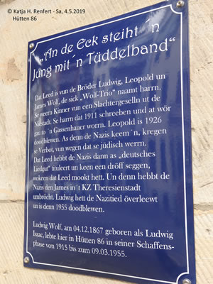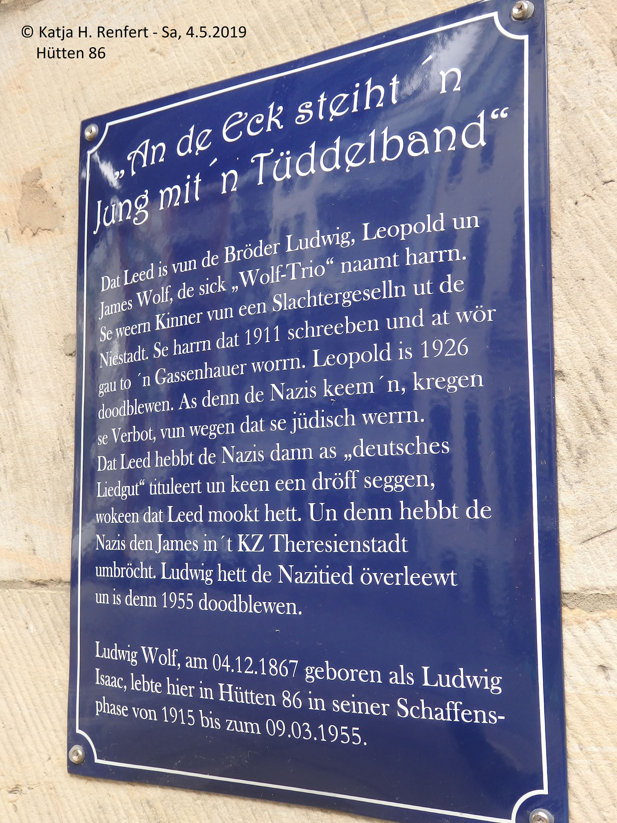 Trüch kaamt Se denn mit den Zurück-Knoop op de Browser-Symboolliest. Gistern, an'n 4. Mai 2019, woor in Hamborg in de Straat Hütten 86 fierlich de Bronze-Skulptur Der Jung mit dem Tüdelband vun den Künstler Siegfried Assmann enthüllt un inwieht. Siegfried Assmann, de in Groothansdörp wahnt, is bekannt för sien Arbeiten in Bronze, avers ok för Glasmalerie un de Gestalten vun moderne Karkenfinster. Un woso woor utrekent düsse Skulptur utrekent över düt Huus opstellt? Wieldat hier, in Hütten 86, Ludwig Wolf wahnt hett, een vun de "Gebrüder Wolf", de dat wiedhen bekannte Hamborger Leed An de Eck steiht 'n Jung mit 'n Tüdelband maakt hebbt. An em un sien Bröder schall de Skulptur erinnern. (Hier de Bericht över de Bröder Wolf vun Dieter Guderian, en Nafahrn vun en Wolf-Broder, de leider doodbleven is.) Ut Sweden is dorför ok Ludwig Wolfs Dochter, de 90-jährige Lieselotte Höbejögi, anreist. In dat smucke Huus is hüüt en Restaurant-Café, to kennen an sien rode Markisen.