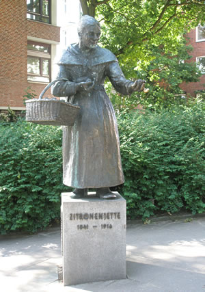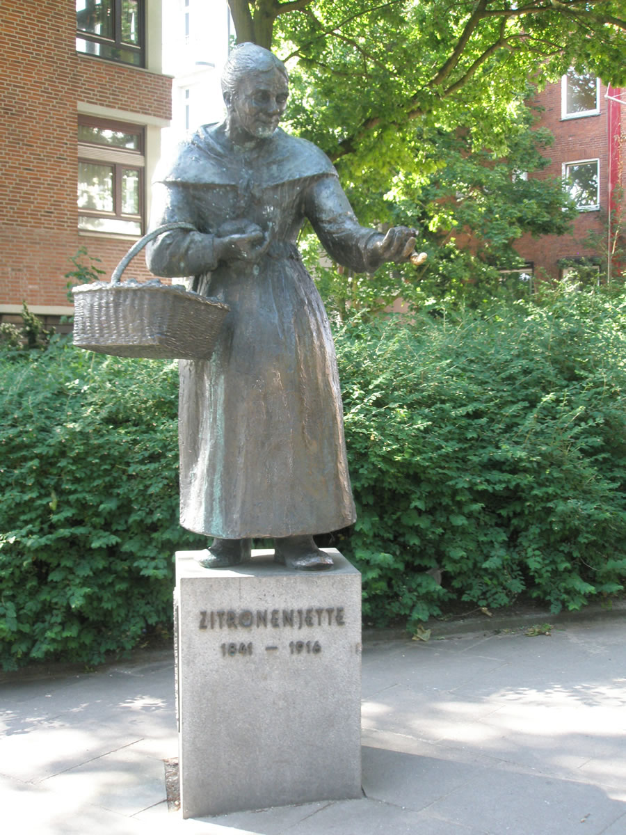 Vun de U-Bahn-Statioon Rödingsmarkt in Hamborg, links de Ludwig Erhardt-Straat lang, in Richt to uns "Michel" (St. Michaelis-Kark), steiht an'ne Trepp, ünner een Boom, de Skulptur "Zitroonen-Jette" vun den noorddüütschen Bildhauer Hansjörg Wagner (*1930). Dat Denkmal woor 1986 opstellt un wiest Jette as levensechte Figur. An'n Sockel steiht: Dien Leben wer suur as de Zitroonen, Dat klingt düster un maakt niegschierig. Wat hett dat wohl würklich op sik mit de "Zitronenjette" un ehr suur Leven? Johanna Henriette (kort: Jette) Marie Müller is an 18.7.1841 vun ehr leddige Modder in Dessau (Sachsen-Anhalt) op de Welt bröcht warrn; de beiden sünd aver bald na Hamborg ümtrocken, wo de Modder heirat un noch en poor mehr Kinner kregen hett. Jette harr as vullwussen Fru bloots en Grööt vun 1 Meter 30 un weegt 35 Kilo. Ofschoonst de Minschen fröher nich so hoochwussen weern as hüüt, weern 1,30 m doch lütt ok för Jette ehr Tied. Dat düüdt op hen, dat Jette as Kind "mangelernährt" weer keen Wunner nich. Opfällig weer ehr breet Nees, to de mennigeen "Knollnees" seggt hett. Wegen düt Utsehn un wieldat se koppswack un unsülfstännig weer, hebbt de Kinner ehr oftins foppt. Jette hett mit een vun ehrn Süstern in dat "Gängeviertel" in'n Stadtdeel "Neustadt" wahnt. Ehrn Naam "Zitroonen-Jette" hett se kregen, wiel se siet ehrn 15. Lebensjohr an en Platz an'n "Graskeller" (dat is an'n Alsterfleet, dicht bi de S-Bahn Stadthausbrücke) un in verscheden Kröög in'ne Binnenstadt un St. Pauli Zitroonen verköfft hett. Se kunn kuum lesen un ehrn Naam bloots mit Möh schrieven; tellen kunn se bi so wat bi 6 Mark. Allerdings hett se uk gor nich so veel verdeent an een Dag.