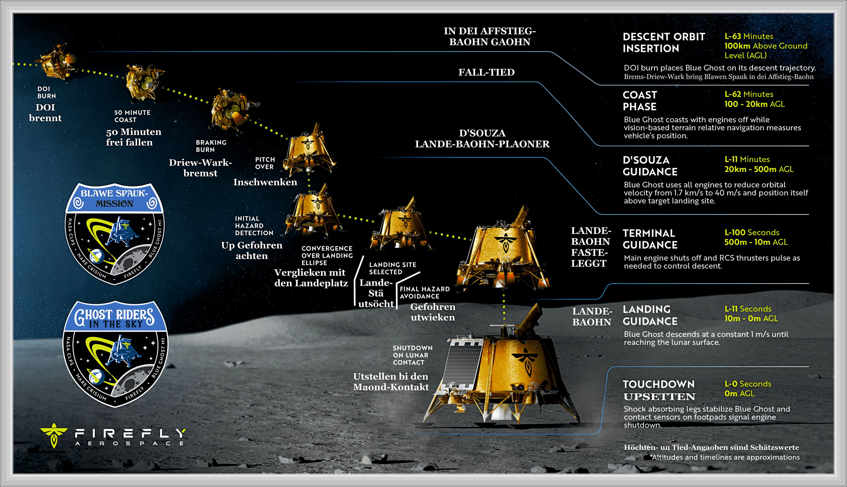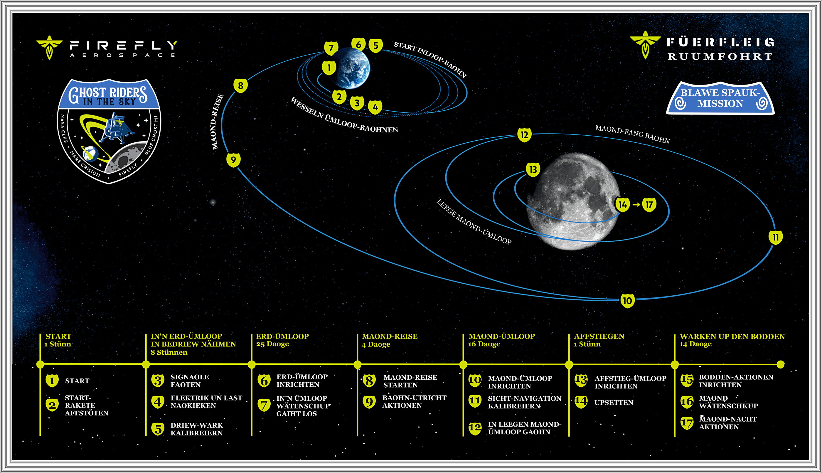 An’n 15. Januar 2025 steeg van dat Kennedy-Zentrum dei Falcon-9-Rakete mit ehre Lasten up. An’n 13. Februar 2025 güng dat Blawe-Spauk-Ruumfohrtüg äöwer in den Maond-Ümloop un dö an’n 2. März 2025 in dat Mare Crisium landen (bi 18,562°N un 61,810°O). Nu staiht dei Apparaot bold 4000 Meter gägen dat Zentrum van den Mons Latreille. Nu warkte dei Lander 346 Stünnen bi Daogeslecht un kunn noch 5 Stünnen nao den Sünnenünnergang in dei Maondnacht wiederwarken. Dei leßte Funkkontakt köm an’n 16. März 2025. Aale Experimente löpen gaut. Dat kannst hier ankieken (up Englisch).