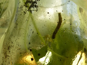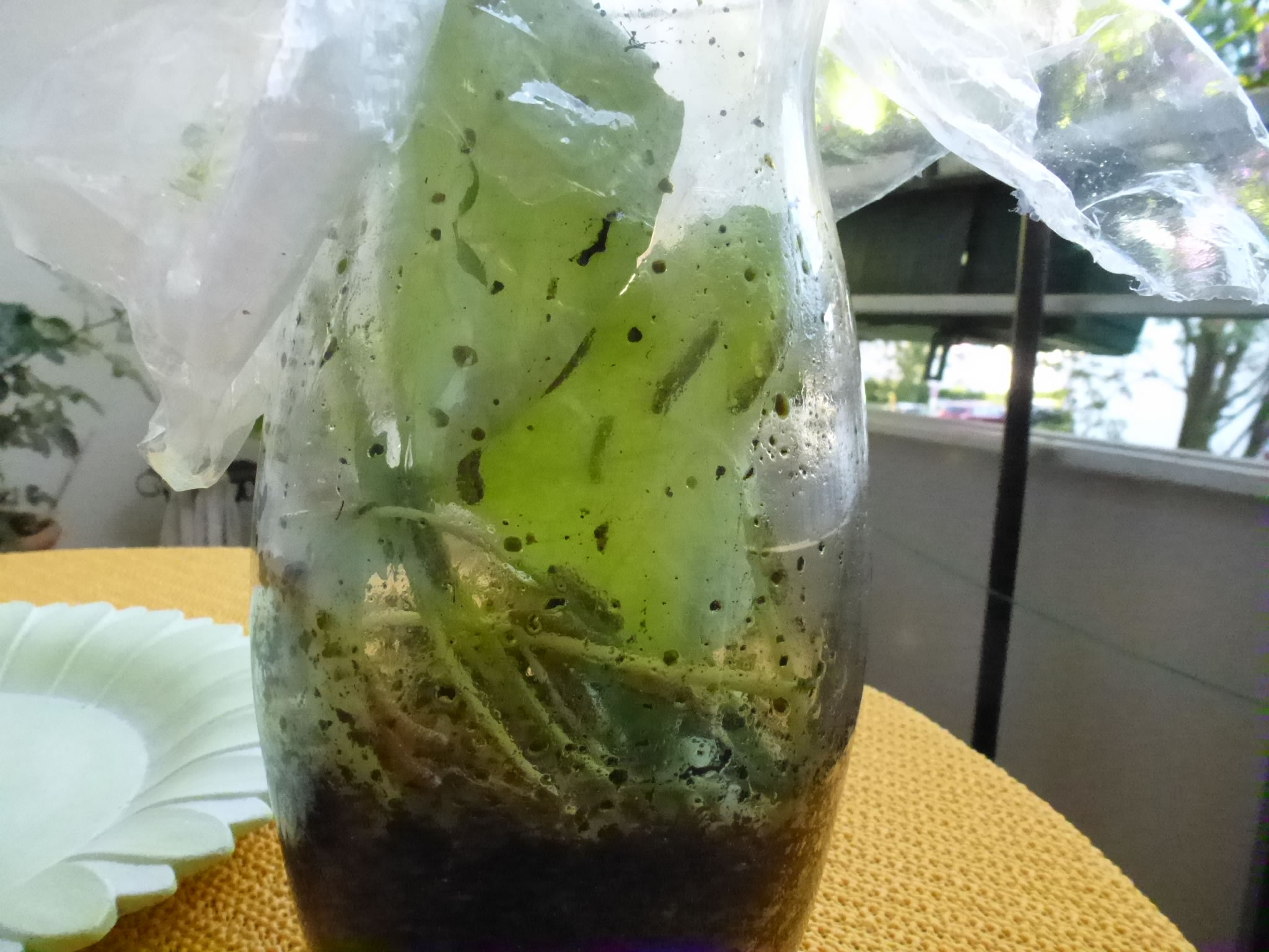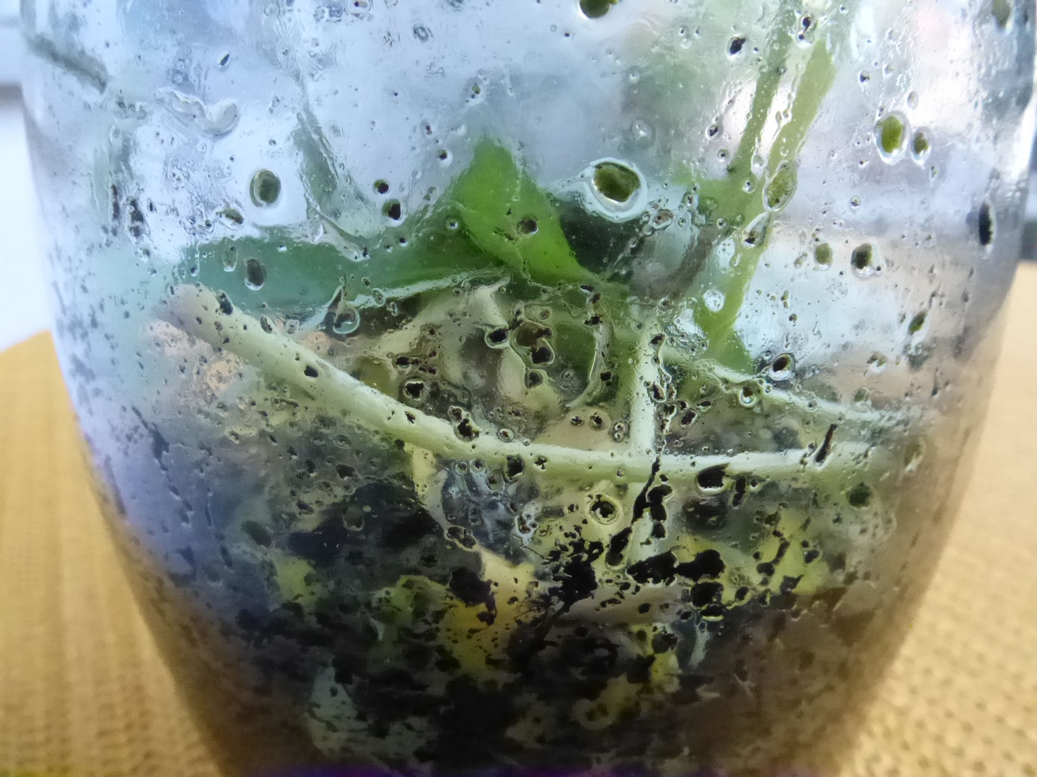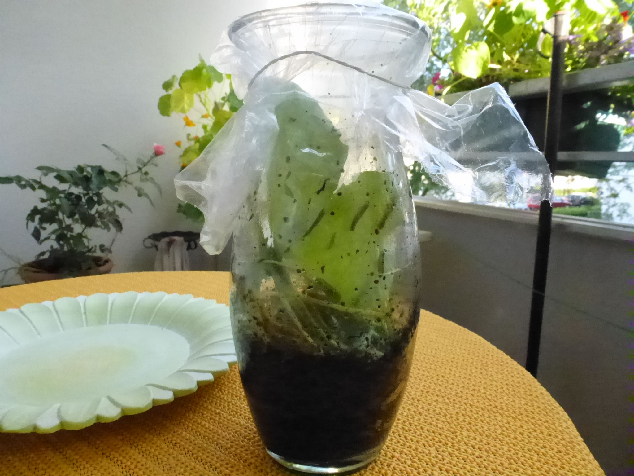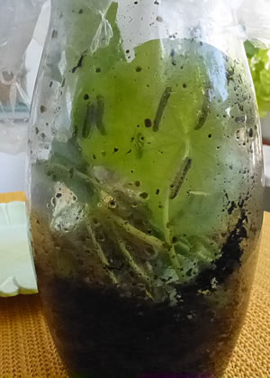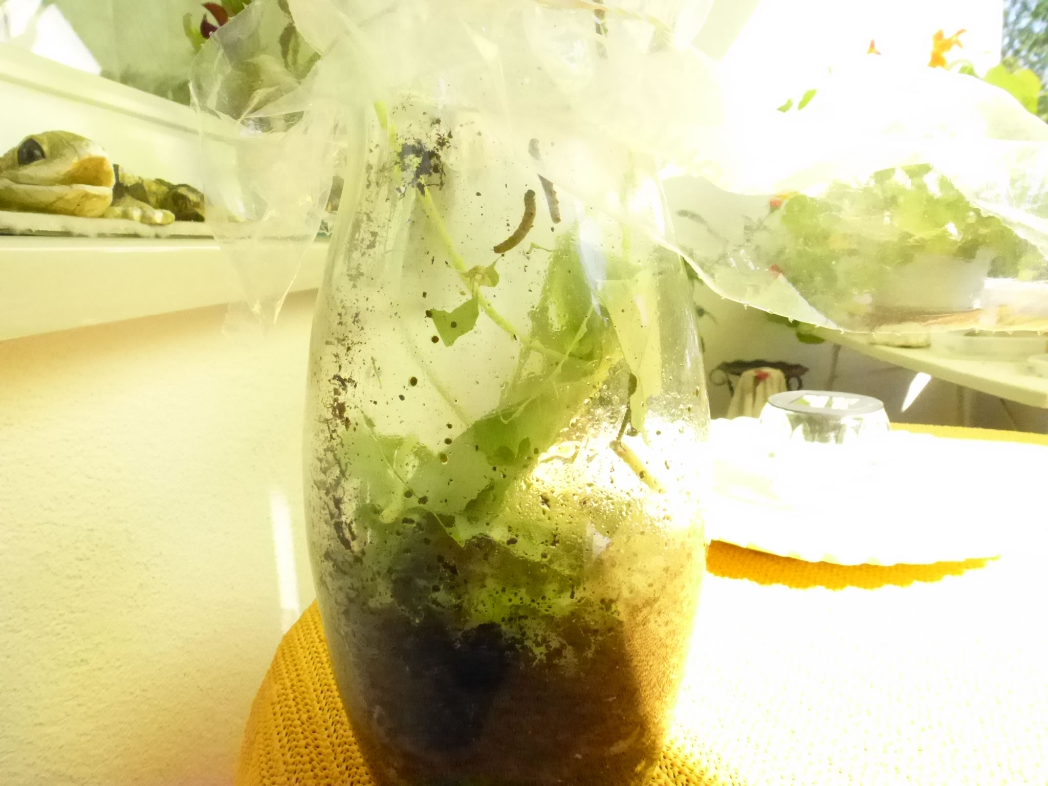 Ik heff so'n lütt Rupennest mit tohörig Bläder von de Kapuzinerkresse in en twee Liter grote dicke Glasvase sett, aver nich mit Water. Beten Eer toeerst op'n Grund dorto, dormit sik dat lütt beten as in de Natuur anföhlt. Baben heff ik denn Plastikfolie överbunnen un düchtig Löcker rinsteken. All Neeslang heff ik mi de niege Botterlicker-Tucht ankeken. Wenn
