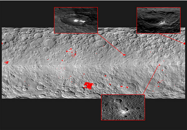 Up Ceres fünd man äöwer 130 lechte Stäen, meest bi wisse Inschlag-Kraoters. Studien, äöwer dei Andreas Nathues an dat Max-Planck-Institut för Sünnenforschkung in Göttingen dat Leit harr, wiesden, dat dat lechte Materiaol mit eine Ort van Magnesiumsulfat, Hexahydrit neumt (Mg[SO4]·6H2O), äöwereinstimmt. Eine annere Ort van Magnesiumsulfat kennt man up dei Eern as Bittersolt. Nathues un siene Maten ünnersöchden Biller van dei Framing-Kamera van Dawn. "Dorbie kreeg man rut, datdisse välen soltigen Stäen achter bleeben, as dat Waoter-Ies in dei vergaohn Tieden sublimeierde. Asteroiden-Inschläge häbbet woll dei Mischkung ut Ies un Solt freileggt", säen dei Forschkers. "An den globaolen Charakter van Ceres, mit siene lechten Stäen, kann man seihn, dat disse Welt eine Unnergrund-Laoge hätt, mit soltiget Waoter-Ies binnen", sä Nathues.