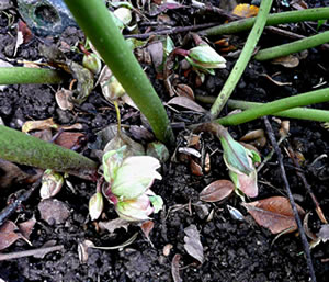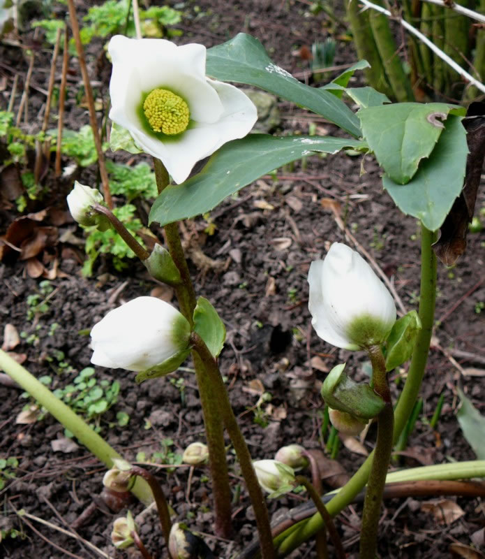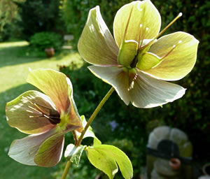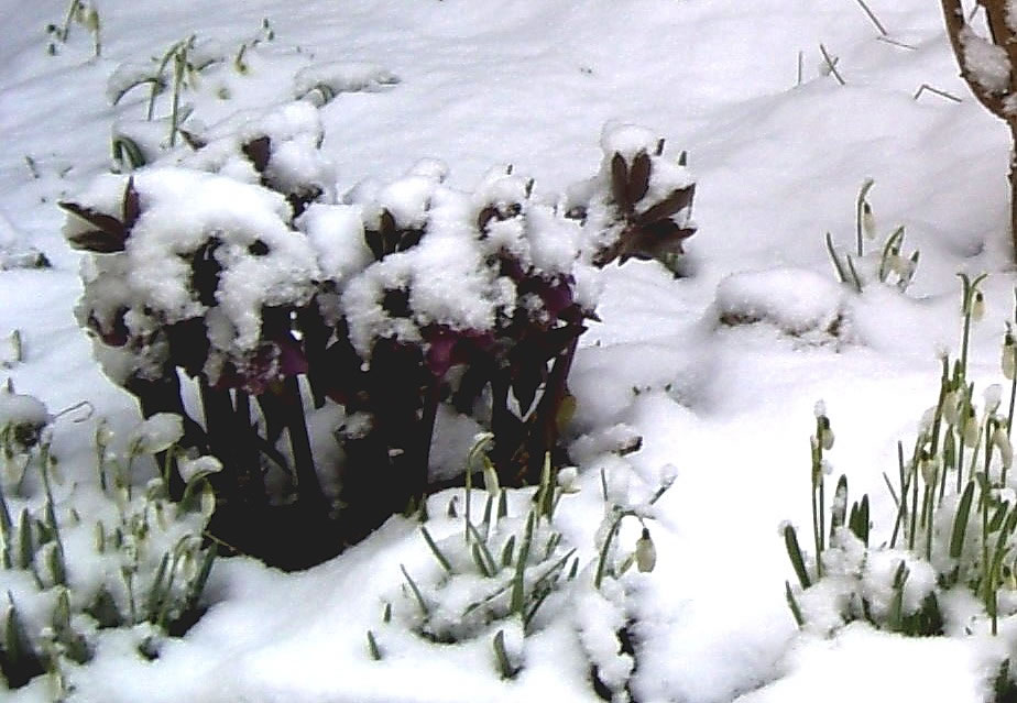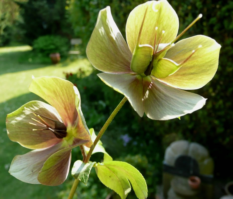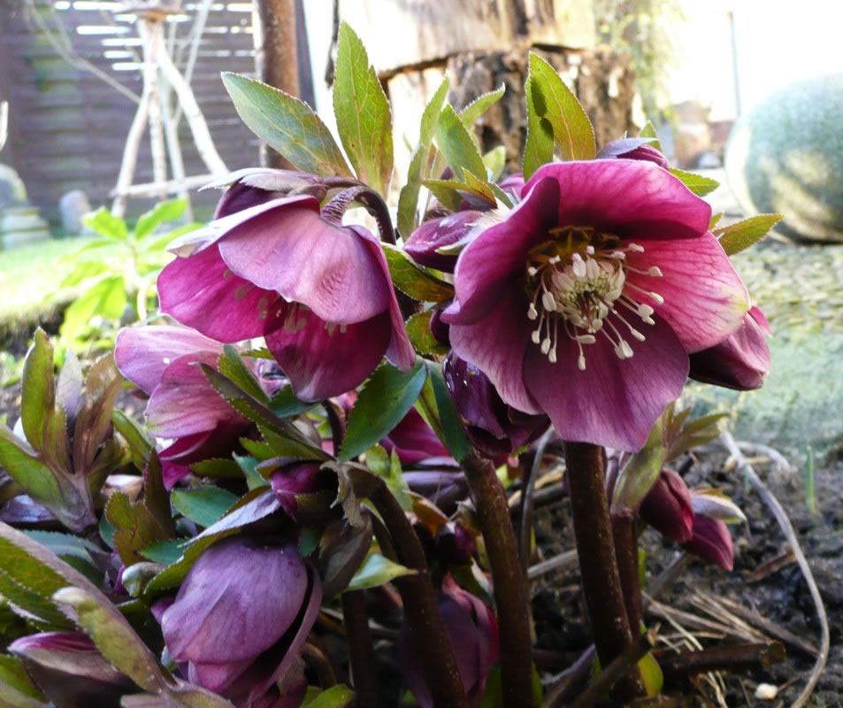 hebbtem so goo Dütt allens harrn de Bloom, de beiden Striethamels in den Goorn höört. Dor meen de rode Sneeroos to de witte Sneeroos: "Wi wüllt ni wedder miteenanner strieden. Freut wi uns, dat wi hier in den Goorn so gut wassen köönt!" De gröön Nieswurz nik mit den Kopp dorto un reep vun ünnen ut den Goorn: "In't Öller seht wi doch alltohoop teemlich liek ut. Uns smucken Blöden sünd denn so'n beten griesgröön!" All Biller: © Antje Heßler