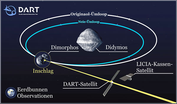 DART steeg, as plaont, an'n 24. November 2021 up. Siet dei Tied löpp DART up eine eerdnaohe Baohn üm dei Sünne up den Asteroiden Didymos tau. Dat is dei, den sei sik as Testobjekt utkeken hefft. Up den Weg dorhen schall DART noch twei annere eerdnaohe Asteroiden, CB21 un Orpheus, beobachten. Dorbi knipst DART Biller in dat sichtbore Lecht-Spektrum. Midde September 2022 schall dei LICIA-Kassen-Satellit (LICIAKas) van DART affspringen. (Mehr äöver Kassensatelliten hier.) An'n 26. September 2022 schlait DART up den Asteroid Dimorphos in. LICIAKas knipst bi't Vörbifleigen dissen Inschlag. Tau disse Tied is Didymos blots 11 Millionen km van dei Eern weg, so kann man van dei Eern ut den Inschlag mit optischke Teleskope seihn. Dat Lowell Discovery Telescope van dat Lowell Observatory in Arizona un uck Radarsysteme staoht hierför praot.
