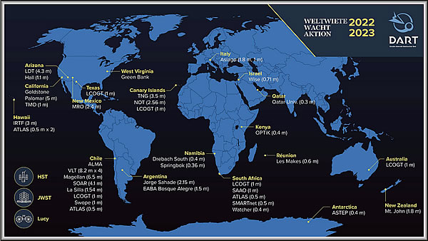Dei Forschker-Mannschkup* werd mit boddenstaohn Teleskope ünnerseuken, off dei Dart-Upschlag den Ümloop van Dimorphos üm Didymos ännern dait. Dei Forschkers räket dormit, dat dei Upschlag den Ümloop van Dimorphos so üm 1 Prozent off bold üm 10 Minuten körter maokt. Dat naue Mäten, wo daone dei Asteroid afflenkt wörd, hört tau disse groote Testaktion. Asteroid Didymos (baoben lünks) un sien Mini-Maond Dimorphos,