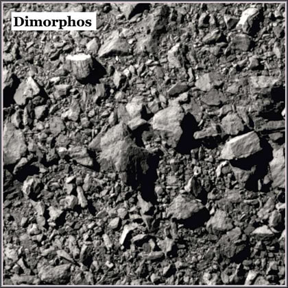 Dat leßte heele Bild van den Asteroid-Mini-Maond Dimorphos knipsde dei Dart-Kamera DRACO mit einen Affstand van üm un bi 12 Kilometer tau den Asteriod un 2 Sekunnen vör den Upschlag. Dat Bild wiest eine Asteroid-Stäe, dei 31 Meter breit is.