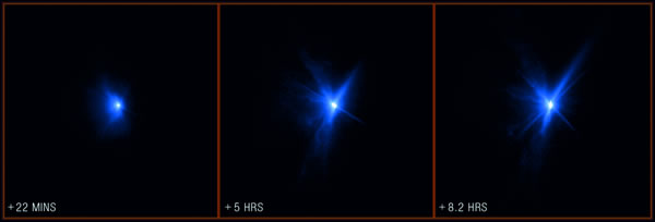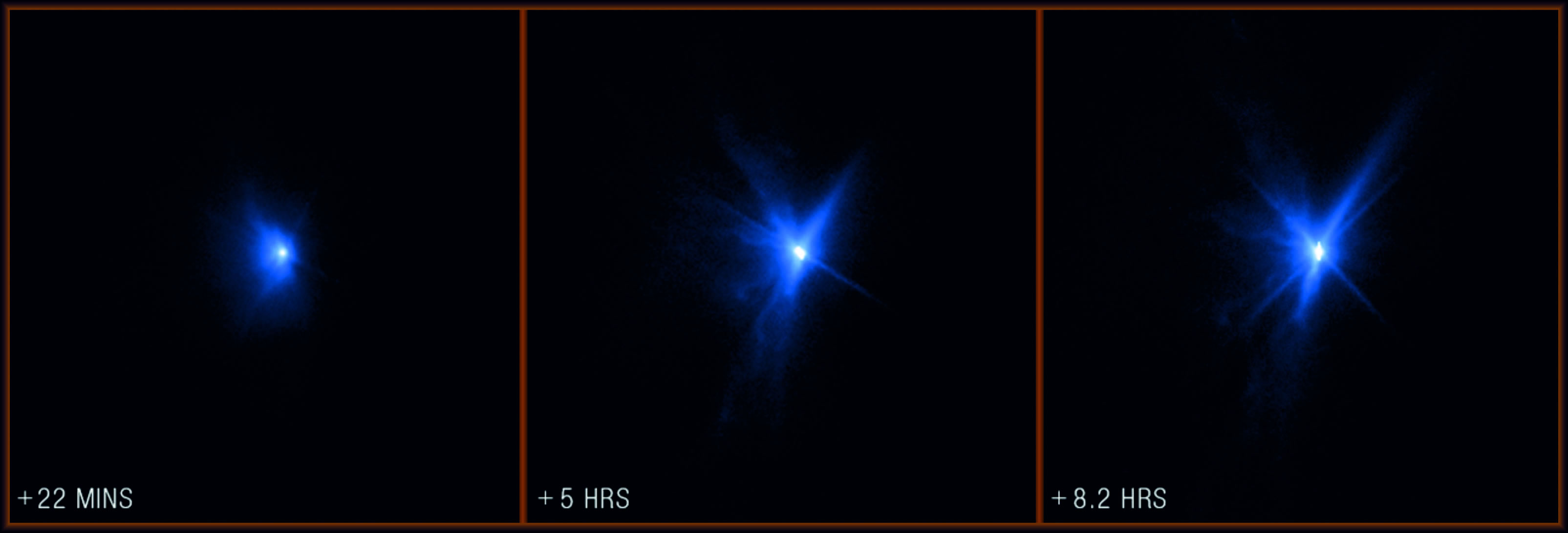 Disse Biller baoven mök dat NASA-Hubble Weltruum-Teleskop 22 Minuten, 5 Stünnen un 8,2 Stünnen nao den vörseihn DART-Upschlag up Dimorphos. Dei wiest uteinannerstuuwen Materiaolfaohnen van den Asteroidbodden. Disse Hubble-Biller wiest upstiegen Upschlagmateriaol, dat man as Straohlen süht, dei van den Asteroid affgaoht. Dei gröttere, updeilte Spitze van dat rutschmäten Materiaol lünks van den Asteroid ligg in dei Richtung, ut dei DART ranflög. In disse Hubble-Biller seiht dei Astronomen mit Pläseier, dat dat Didymos-System nao den Upschlag drei maol lechter schinnt. Besünners andaon sünd dei dorvan, dat uck noch acht Stünnen nao den Upschlag disse lechte Schien konstant bleef. Süh uck hier: Hubble-Ansichten