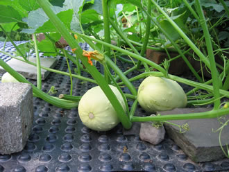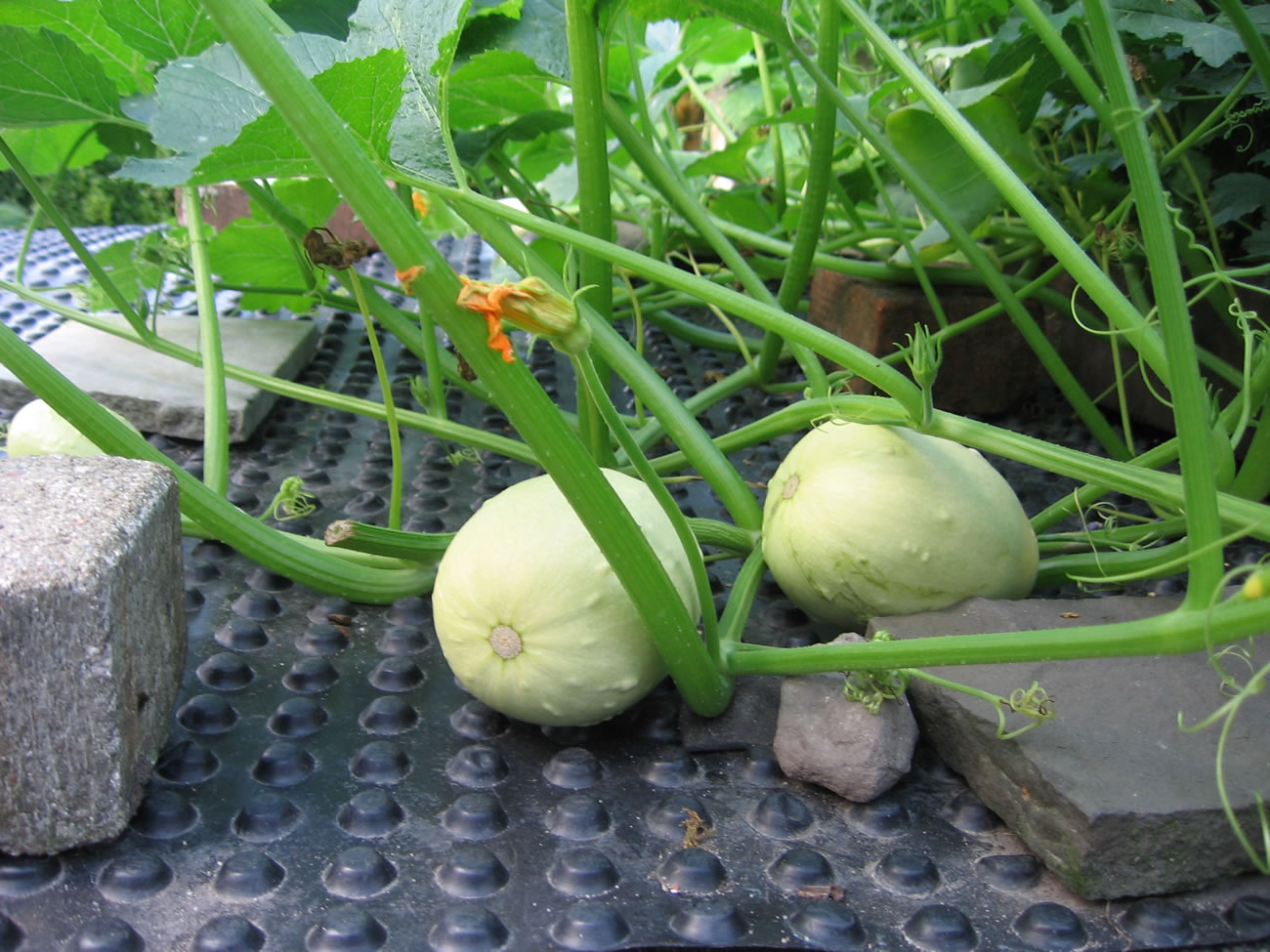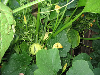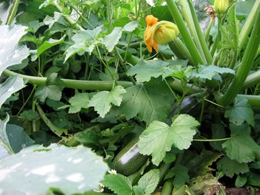 Körbs, Stangenbohnen un Zucchini ranken un wassen tosomen, krupen