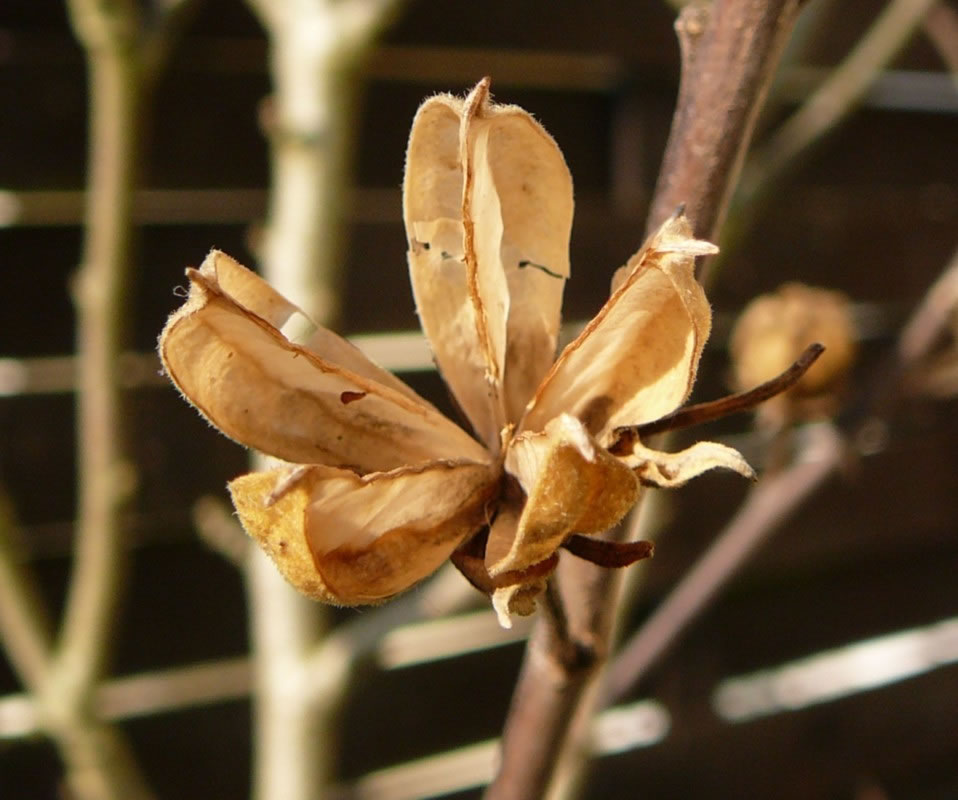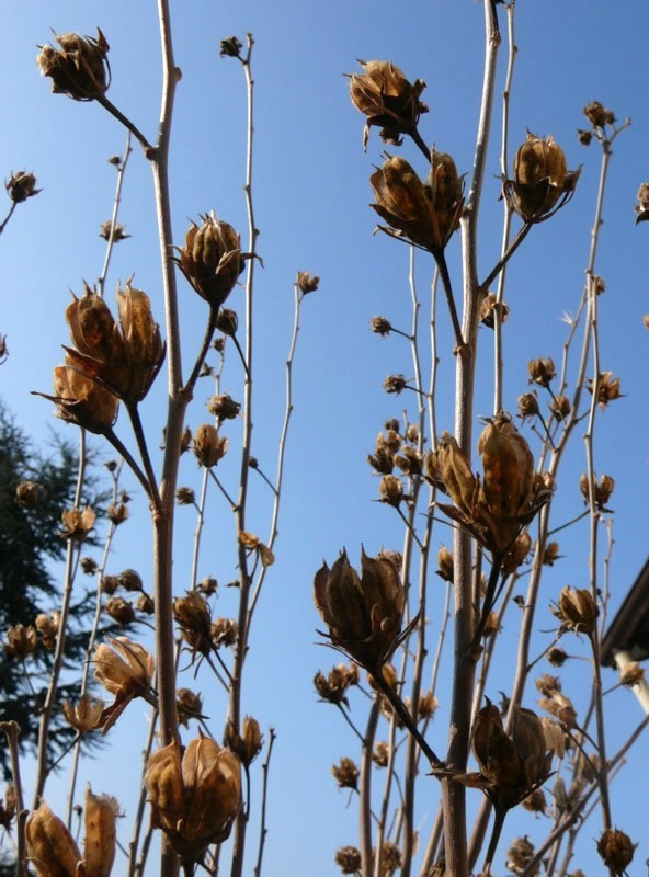 Up de Terrass tummelt sik de Vagels in dat Vagelhuus. Dor steiht an de Plank en Goornhibiskus. In den lütten Boom sett sik geern de Vagels. Vun dor fleegt se in't Vagelhuus. Dat is en Kamen un Gahn. Annerletzt kreeg ik mal mit, dat een vun de Vagels an en Samenkapsel vun den Hibiskus pickt. An den lütten Boom hängt noch vele Kapseln. De fallt eerst in't Fröhjohr af, wenn de Boom niege Bläder drifft.