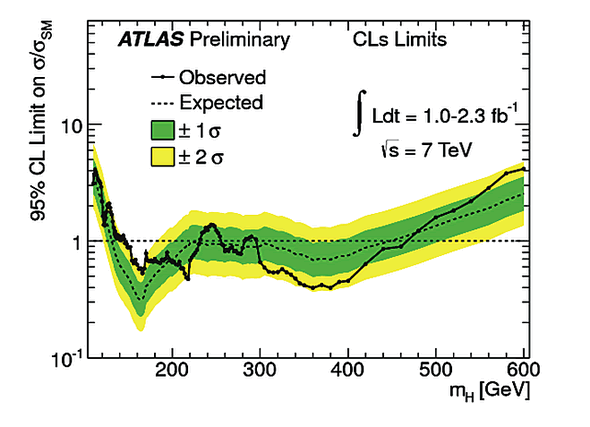 Dei Driever LHC an'n CERN is in dei aktuellen Mätaktschion siet Ende 2009 in Bedriev un lävert sietdem orrig gaut Daoten. Disse werd van dei beiden Experimente ATLAS un CMS upnahmen un unnersöcht. An'n LHC werd Protonen mit eine Energie ümmer van 3,5 TeV tausaomeschaoten. Wägen disse högeren Energien kunn man hier uk möglike Higgs-Bosonen mit eine düütlik högere Masse finnen. Dei experimentellen Resultaote, dei sik wedder ut eine Kombinatschion van väle einkele Anaolysen tausaomesettet, sünd för ATLAS in Bild 3 un för CMS in Bild 4 dorstellt. Beide Experimente käönt dormit dei Existenz van ein as in dat Standardmodell vörutseggte Higgs-Boson in'n Masseraohmen tüschken rund 140 un 450 GeV utschluten. Un wo geiht et wieder? Dei möglike Massseraohmen för ein Standardmodell-Higgs-Boson kunn so van dei Experimente an'n Tevatron un an'n LHC mit dei vörliggen Daoten däget inschränket wern. In dei taukaomen Maonde werd sik dei Anaolysen jüst up einen Masseraohmen, dei unner 140 GeV ligg, konzentreern, den man bit nu hen noch nich utschluten kunn. Dei Signaoturen van ein Higgs-Boson sünd hier düütlik komplexer, un mehr Daoten sünd nödig, dat'm siene Existenz naowiesen of utschluten kann.