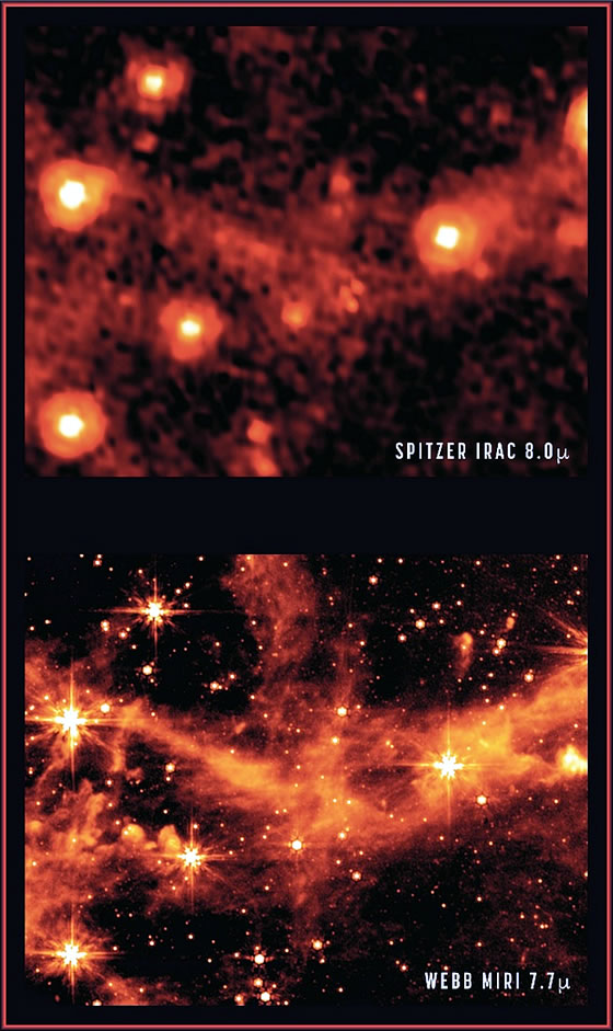 Hier verglick man eine MIRI-Naohupnaohme mit ein ölleret Bild, dat eine Infrarot-Feld-Kamera van dat Spitzer-Weltruumteleskop bi 8,0 Mikrometer upnöhm. Dat utmusterte Spitzerteleskop was dat eierste Observatorium, dat hochuplööste Biller van dat naohe un middel Infrarot-Universum mök. Dat Draokenoge wiest us dör einen dütlick grötteren Hauptspeegel un bätere Detektoren den Infrarot-Häwen mit eine bätere Klorheit. So kann man noch mehr Saoken in den Weltruum finnen. Hier wiest MIRI dat interstellore Gas in orig väle Einkeldeile. Man süht hier uck dei Emissionen van polyzyklischke aromaotischke Käöhlenwaoterstoffe (PAK). Dat sünd Moleküle ut Käöhlenstoff un Waoterstoff in wisse Krings. Dei spält eine wichtige Rulle in dei Warmte-Bilanz un dei Chemie van interstellore Gase. Wenn Draokenoge mit dat Wätenschkup-Wark anfang, käönt dei Astronomen mit MIRI dei Geburt van Sterne un protoplanetore Systeme studeiern.