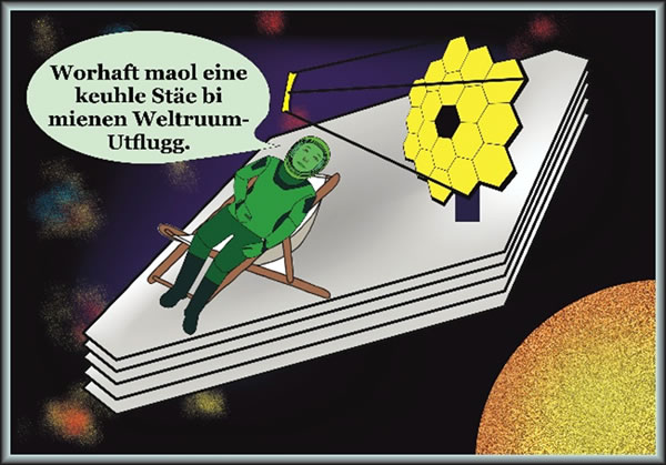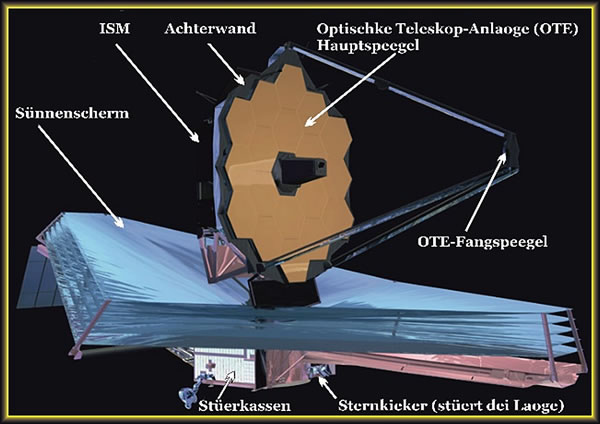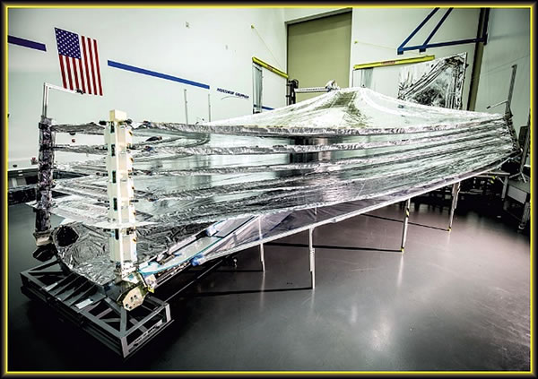 Dei NASA un ehr Industrieverband fünnen ein lichtet, orig fastet Wark, wat dat Teleskop un dei Speegels van dei Infrarotstraohlung van Sünne un Eern affschermt. Einkelne Saoken, dei den Sünnenscherm besünners maokt, sünd ein starket, aower ultradünnet Materiaol, dei spezielle Draokenform un dei besünnere Funktion van dei Laogen.